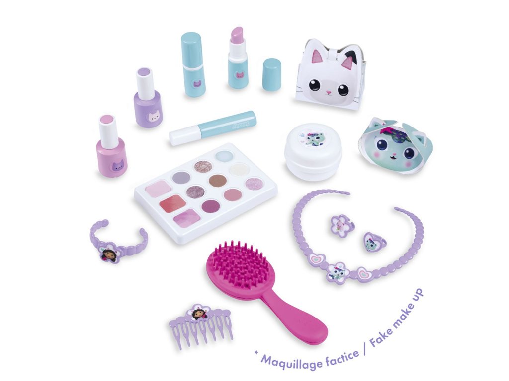 Kosmetický kufřík v designu Gabby´s Dollhouse je naplněn vším, co je potřeba pro skvělé mobilní wellness, ať už jde o účes, nehtový salon nebo make-up. Všech 15 doplňků (atrapy kosmetiky ke hraní) najdete uvnitř kufříku s rukojetí, který lze vzít kamkoli: 2 laky na nehty, 2 rtěnky, paleta očních stínů, řasenka, štětec, spona, hřeben, náhrdelník, náramek, 2 prsteny, nádobka na krém a 2 krabičky. Díky možnosti zamčení se na cestě z kufříku nic neztratí. Navíc má zrcadlo a tajnou přihrádku. Police uvnitř lze sklopit, pro vytvoření prostoru pro další kosmetiku. Rozměry produktu (DxŠxV): 35,5 x 28,6 x 28,5 cm.Doplňkové parametry