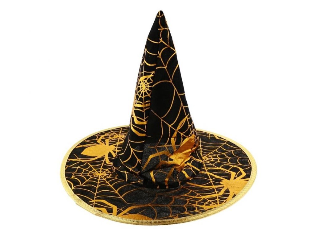 Párty čarodějnický klobouk se zlatou pavučinou. Obvod: 58 cm.Doplňkové parametry