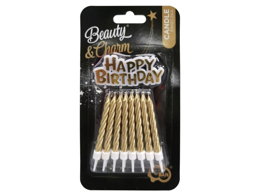 Zlaté dortové svíčky o délce 8 cm s podstavci a zlatým nápisem HAPPY BIRTHDAY. V balení 16 ks.Doplňkové parametry