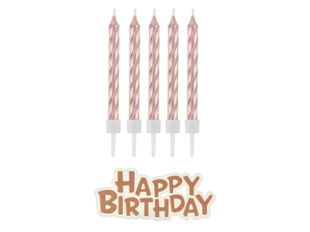 Měděné dortové svíčky o délce 8 cm s podstavci a zlatým nápisem HAPPY BIRTHDAY. V balení 16 ks.Doplňkové parametry