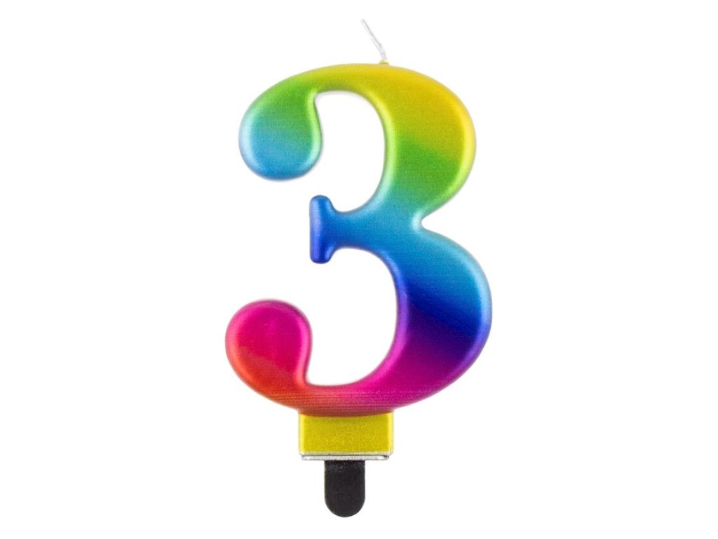 Duhová dortová svíčka č. 3 s metalickým leskem.Doplňkové parametry