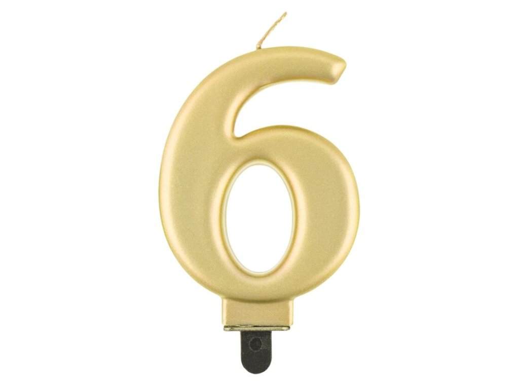 Zlatá dortová svíčka č. 6 s metalickým leskem.Doplňkové parametry