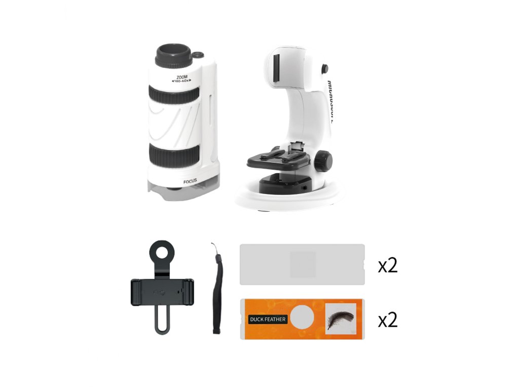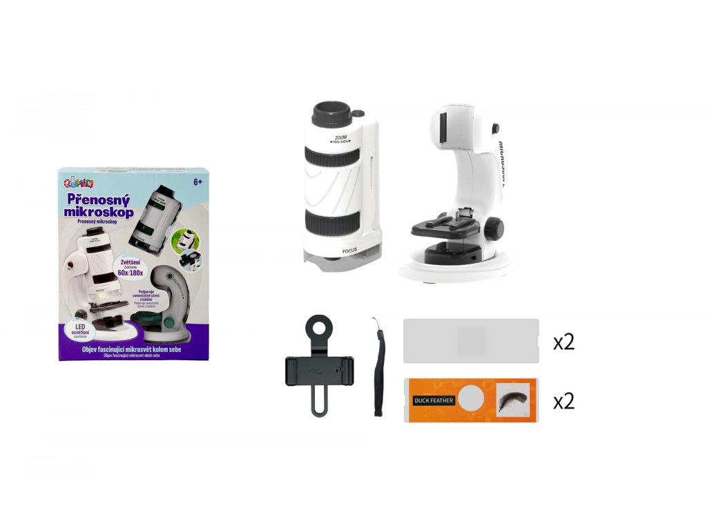 Lehký a kompaktní společník pro objevování mikrosvěta kdekoli a kdykoli. Jeho hlavní výhodou je mobilita. Zkoumat s ním lze i doma na stole, ale na rozdíl od stolních laboratorních mikroskopů je navržen tak, aby tělo mikroskopu šlo snadno oddělit od držáku a vešel do batohu nebo kapsy. To ho činí ideálním pro terénní pozorování v přírodě, vzdělávací účely na výletech nebo prostě pro domácí zvědavce, kteří chtějí prozkoumat věci kolem sebe zblízka. Ale to není všechno...! Má praktický držák, kterým lze přidělat mobilní telefon na okulár a celé objevování lze rovnou vyfotit a sdílet dál se svými kamarády. Dokonalé pozorování je zajištěno LED světlem. Je to super hračka pro zvědavé děti, které chtějí prozkoumat svět kolem sebe úplně zblízka a zjistit, jak vypadají maličké věci, které normálně přehlédneme.Doplňkové parametry