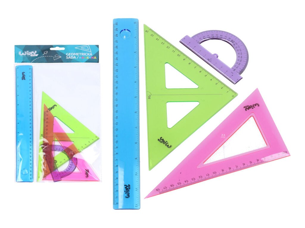 Geometrická sada - barevná. Rovné pravítko 30cm - modré. Úhloměr malý - fialový. 2x trojúhelník - růžový a zelený.Doplňkové parametry