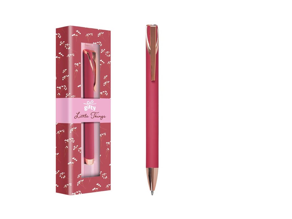 Elegantní volba! Dárkové pero od Gifty – red z řady Little Things je dokonalým spojením stylu a výjimečnosti. Jeho kovové detaily v trendy odstínu rose gold přitahují pozornost v kontrastu s matnou červenou barvou. Díky lehké konstrukci skvěle padne do ruky a umožňuje hladký a plynulý tah při psaní. Jeho příjemný povrch zajišťuje komfort i při delším používání, ať už si zapisujete myšlenky, plánujete den nebo podepisujete důležité dokumenty. Elegantní dárkové balení s jemným květinovým motivem dodává peru jedinečný šarm.Doplňkové parametry