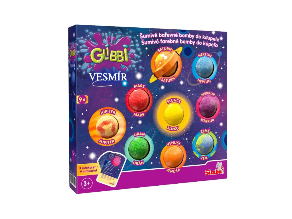 Šumivé barevné bomby do koupele Glibbi Vesmír pomohou dětem naučit se o planetách a Slunci zábavnou formou, během koupání a hraní ve vaně. Sada obsahuje 9 bomb do koupele s hmotností 35 g, z nichž každá reprezentuje jednu planetu. Zábavná fakta i naučné infromace o planetách jsou popsány na kartičkách. Bezpečné pro pokožku, neucpává odpad, snadný úklid, nedělá skvrny, biologicky odbouratelné.Doplňkové parametry