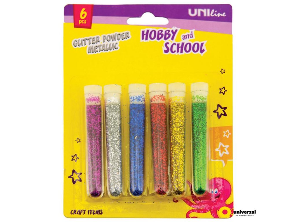 Balení glitrových prášků - 6 barev Barvy: růžová, stříbrná, modrá, červená, zlatá a zelená Hmotnost každé barvy 3g Určeno pro dekoraci papírových výrobků. Výrobek pro ruční práce.Doplňkové parametry