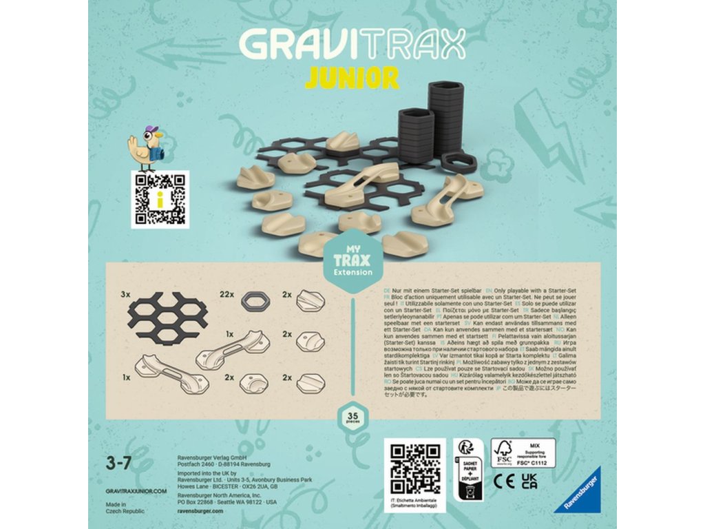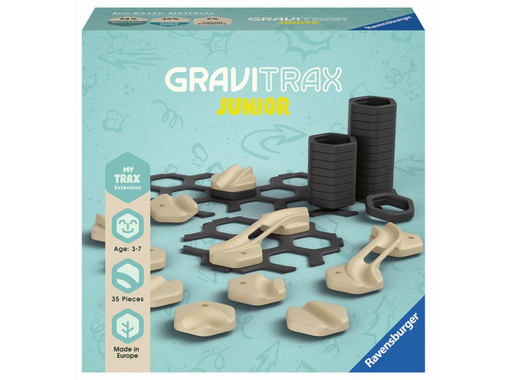 GraviTrax Junior je interaktivní systém kuličkové dráhy pro děti od 3 let. Ti nejmenší si staví své vlastní světy z kuličkových drah, které lze podle libosti zdobit a vytvářet tak jednotlivé tematické světy. Děti si tak při kreativním stavění užijí mnoho zábavy. Chlapci a dívky si mohou stavět své vlastní světy z kuličkových drah, které lze podle libosti zdobit a vytvářet tak jednotlivé tematické světy. Se sadou GraviTrax Junior Dráha lze snadno rozšířit všechny startovní sady. Velké množství součástí vyrobených z dřevěného bioplastu přináší na dráhu ještě větší dynamiku a akci – pro nikdy nekončící zábavu.Doplňkové parametry