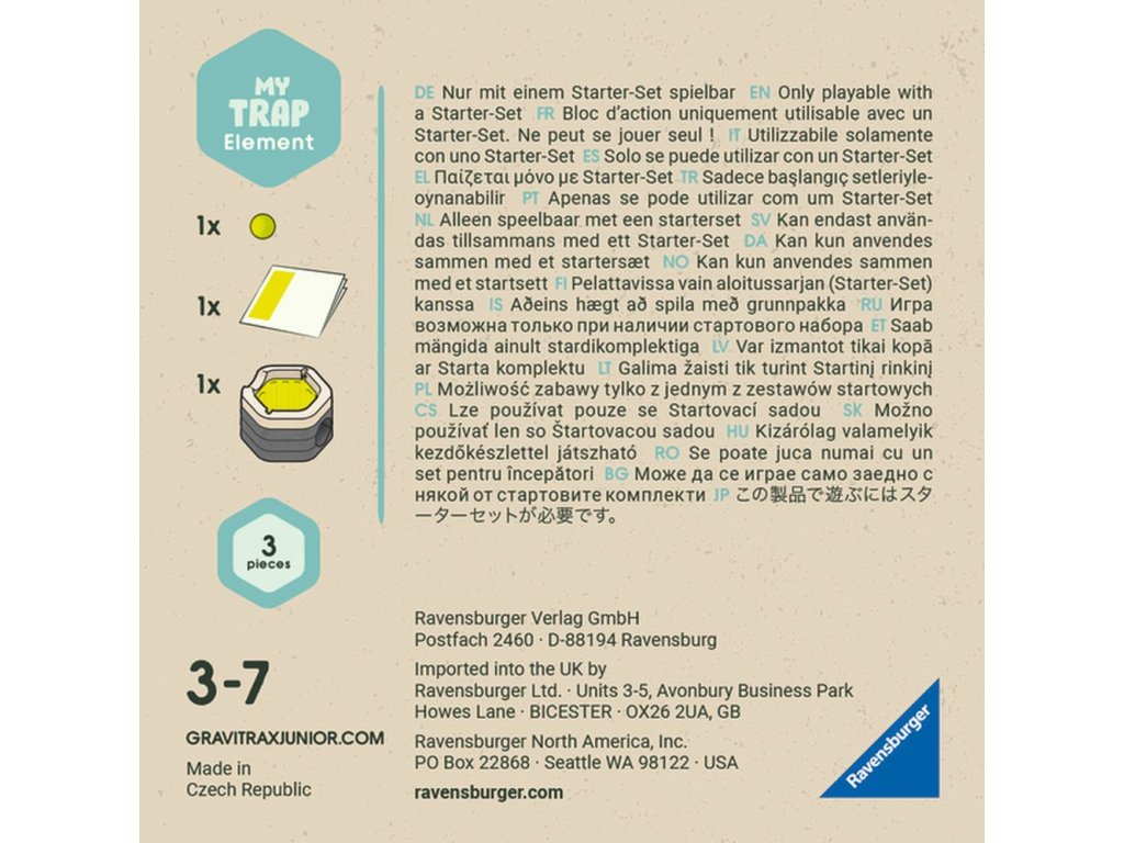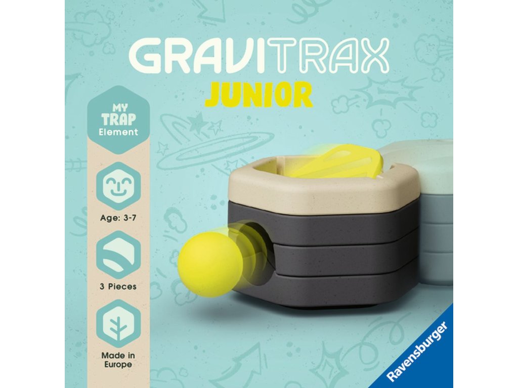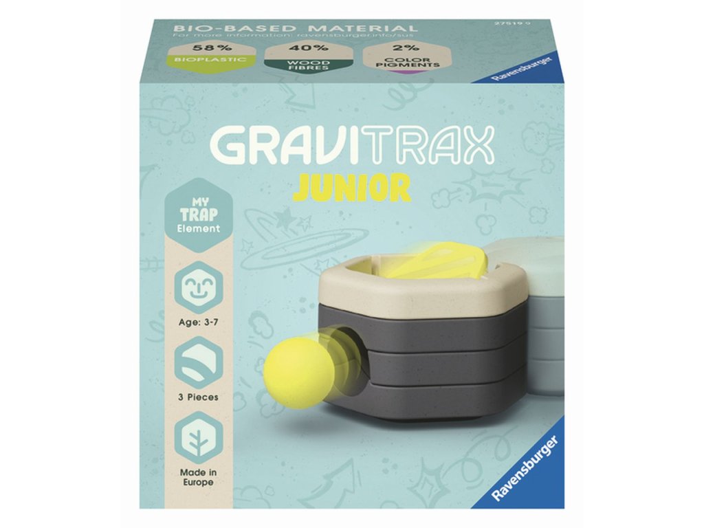 GraviTrax Junior je interaktivní systém kuličkové dráhy pro děti od 3 let. Ti nejmenší si staví své vlastní světy z kuličkových drah, které lze podle libosti zdobit a vytvářet tak jednotlivé tematické světy. Děti si tak při kreativním stavění užijí mnoho zábavy. Chlapci a dívky si mohou stavět své vlastní světy z kuličkových drah, které lze dle libosti zdobit a vytvářet tak jednotlivé tematické světy. Stejně jako všechny ostatní součásti systému interaktivní kuličkové dráhy je doplněk Past vyroben z dřevěného bioplastu. Doplněk Past vytváří v dráze magický efekt, protože kuličku spolkne a ta je vypuštěna v nižším patře. Tímto způsobem můžete postavit ještě napínavější dráhy – pro nikdy nekončící zábavu.Doplňkové parametry