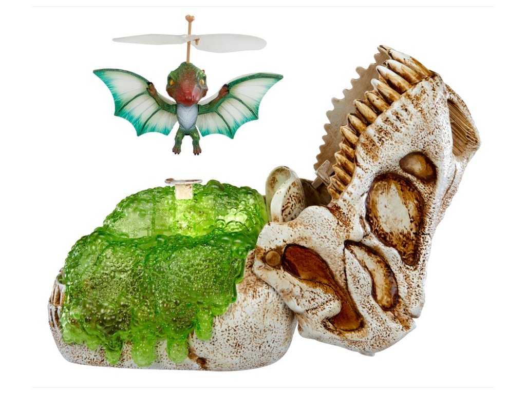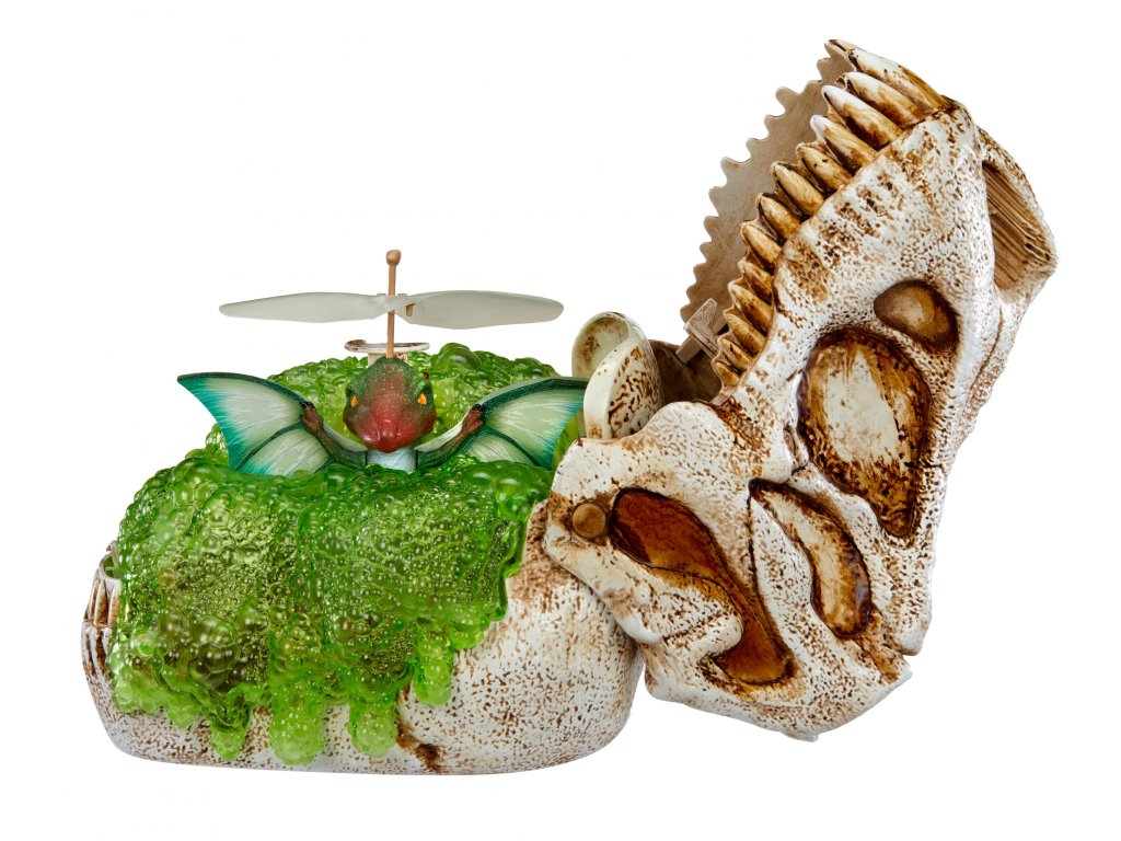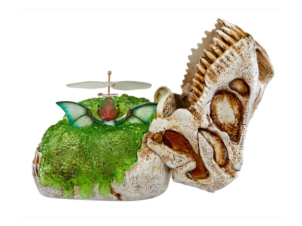 Zatřes se spícím dinosaurem, poklepej mu na lebku, abys ho probudil. Začne se třást, kolébat a s mohutným řevem se otevřou dinosauří čelisti. Sleduj, jak druhý menší dinosaurus vzlétá! Létající dinosaurus poletí podle tvého vedení. Jednoduše pod ním drž ruku a nech ho letět tak vysoko, jak jen můžeš. Létajícího dinosaura můžeš nechat unikat znovu a znovu. 3 druhy. Obsah balení: • 1 dinosauří lebka • 1 Létající dinosaurusDoplňkové parametry