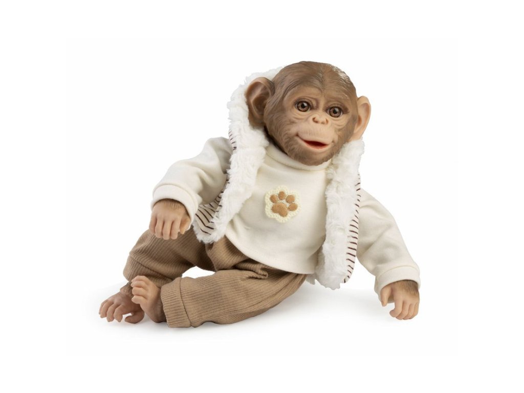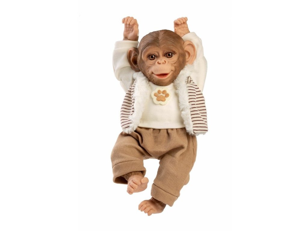 Veselé a roztomilé opičí miminko bez zvuku s měkkým látkovým tělem. Hlava a končetiny jsou vyrobené z kvalitního vinylu. Ruce a nohy jsou k tělu přichyceny kloubem. Opičí miminko je polohovací a může i sedět nebo se dá pověsit za ruce nebo nohy. Velikost 32 cm. Ručně vyrobeno ve Španělsku, baleno v dárkové krabici. Doporučený věk od 3 let.Doplňkové parametry