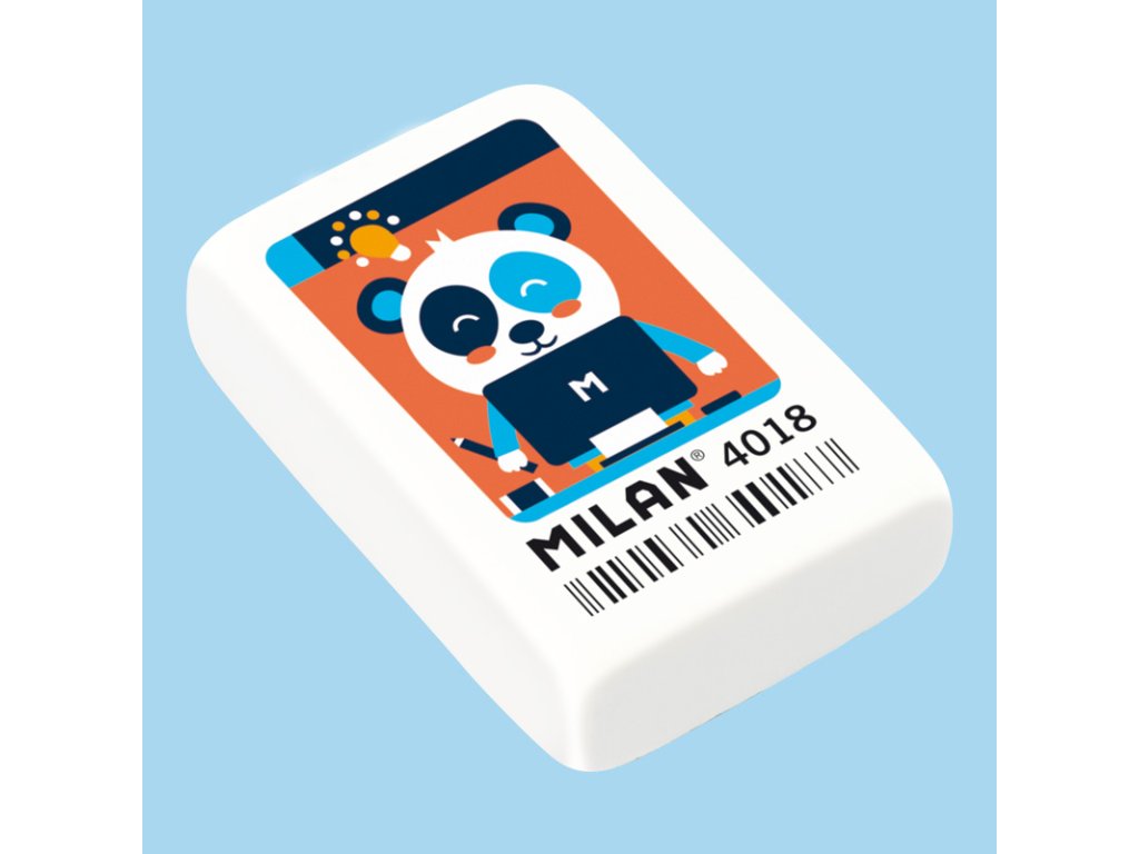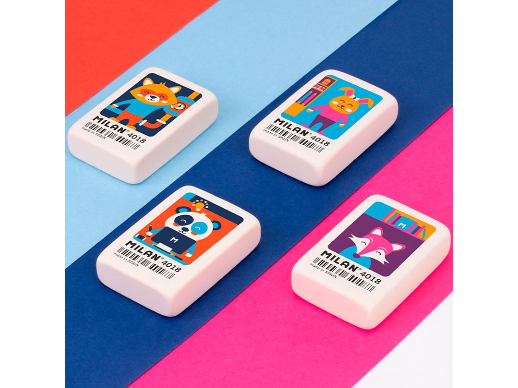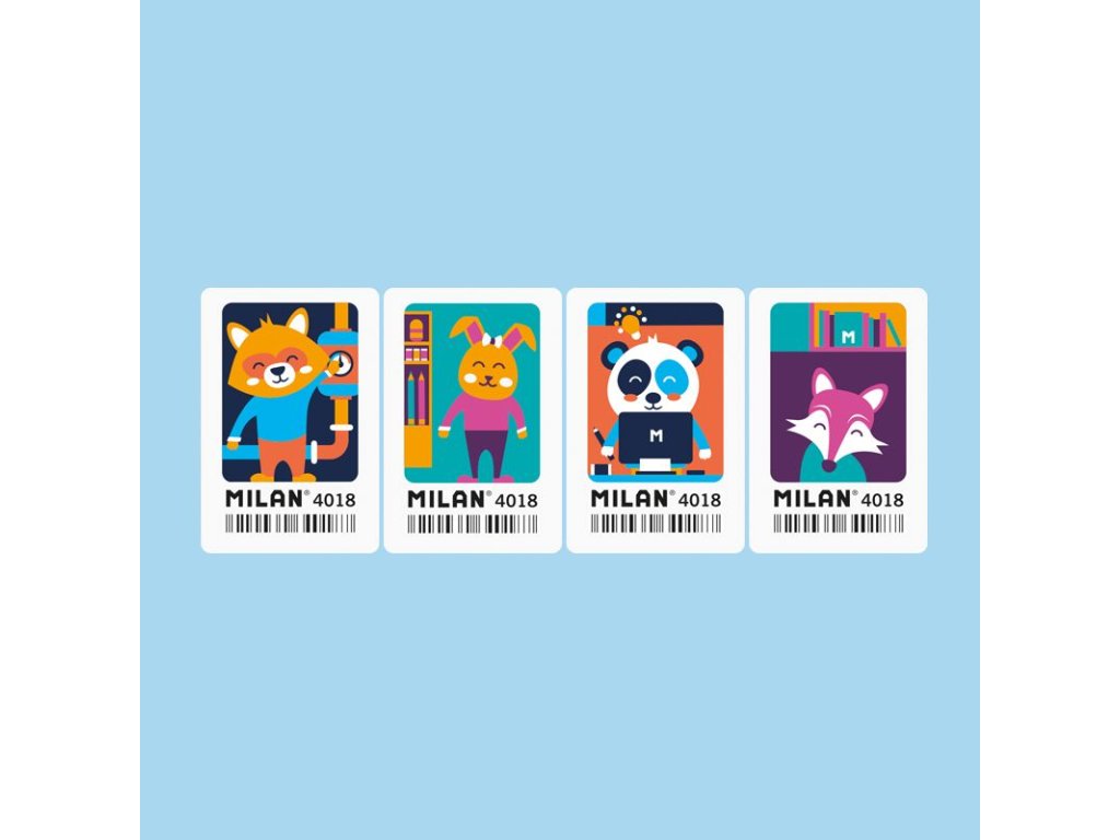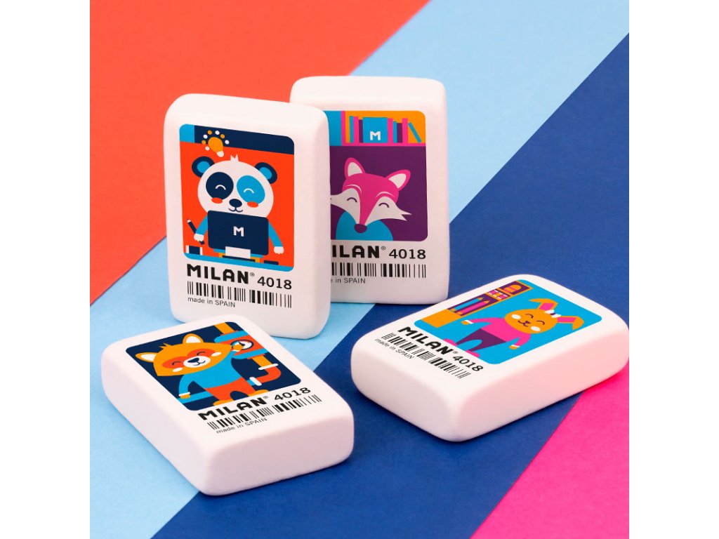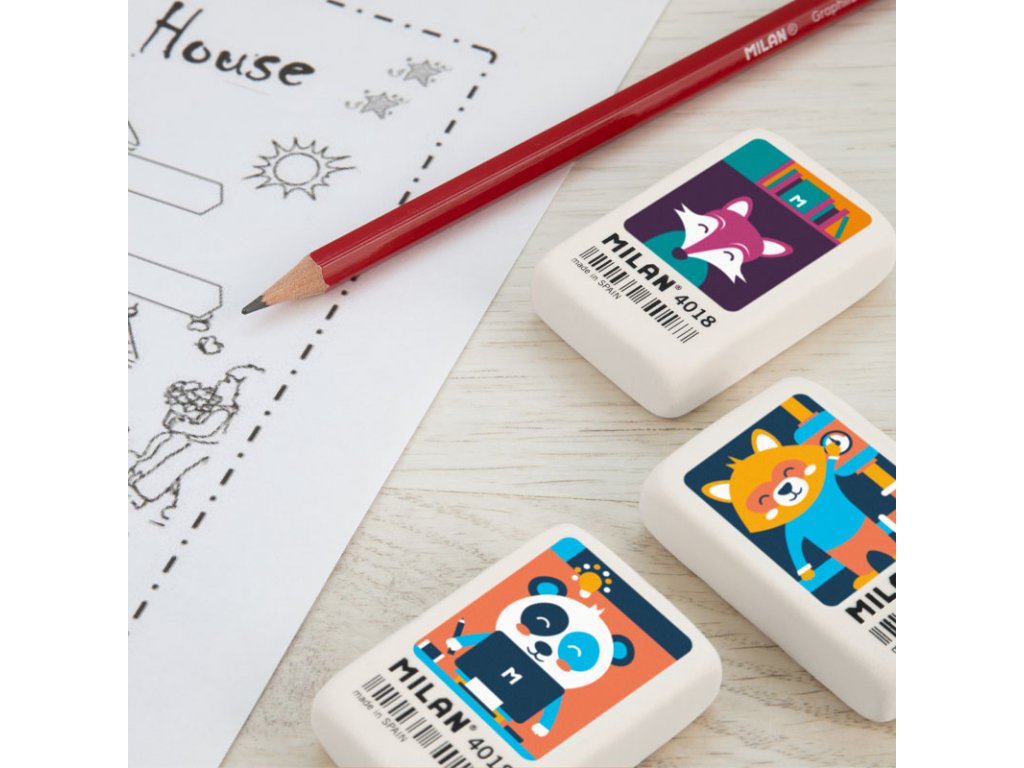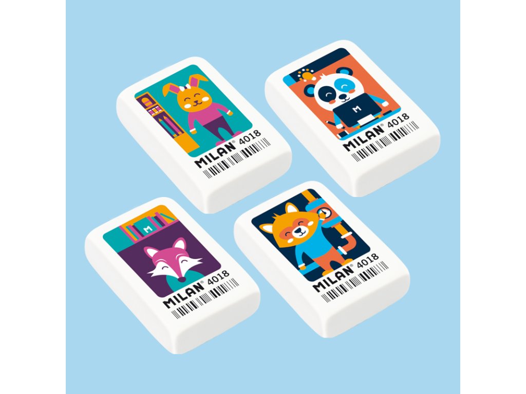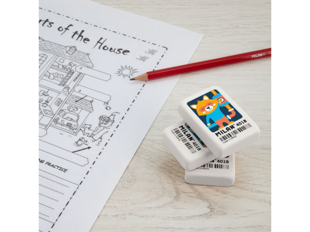 Obdélníková guma MILAN 4018 z měkké syntetické gumy. Může být použita na vymazání široké škály tahů grafitové tužky ze všech druhů papíru. S různými barevnými dětskými motivy.Doplňkové parametry