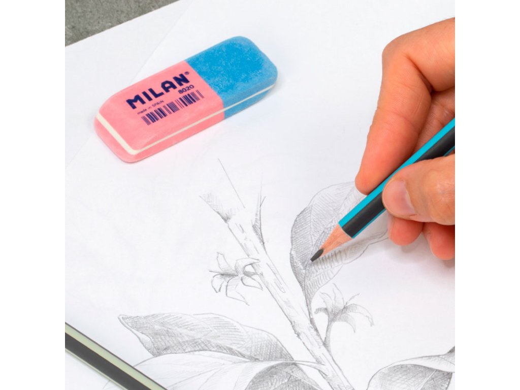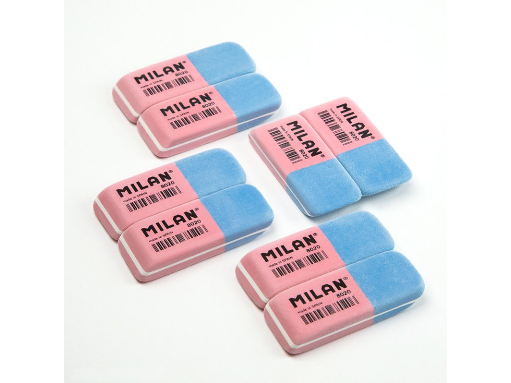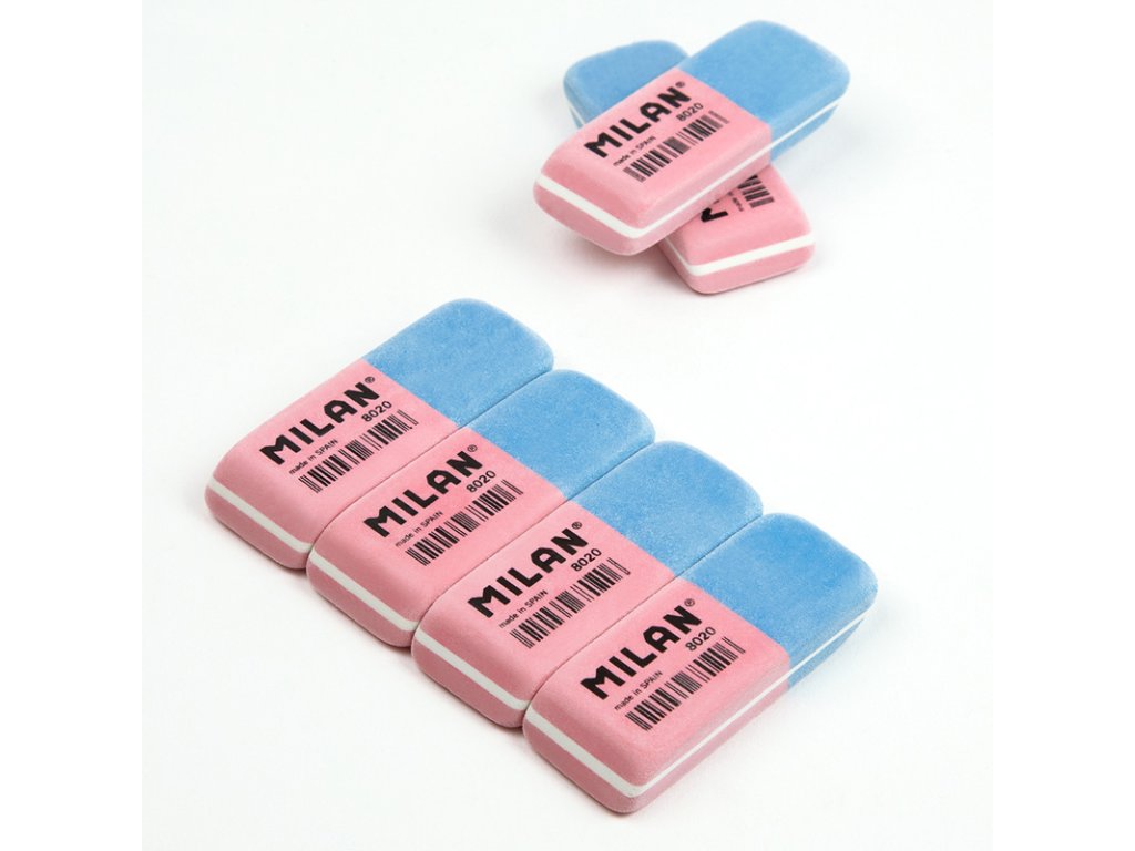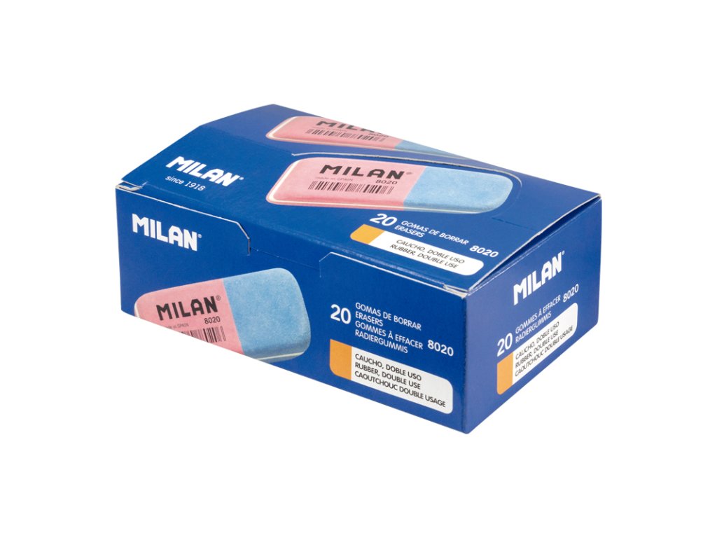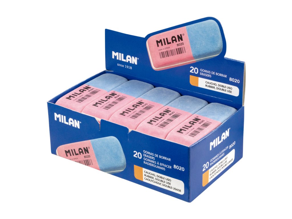 Guma MILAN 8020 je dvojitá guma se zkosenými hranami ze syntetické gumy: pružnější a odolnější. Nabízí dvě silné mazací schopnosti: růžová guma je pružná a dá se použít k vymazání široké škály grafitových tahů tužkou ze všech druhů papíru a modrá guma je abrazivní a má silnější mazací schopnost.Doplňkové parametry