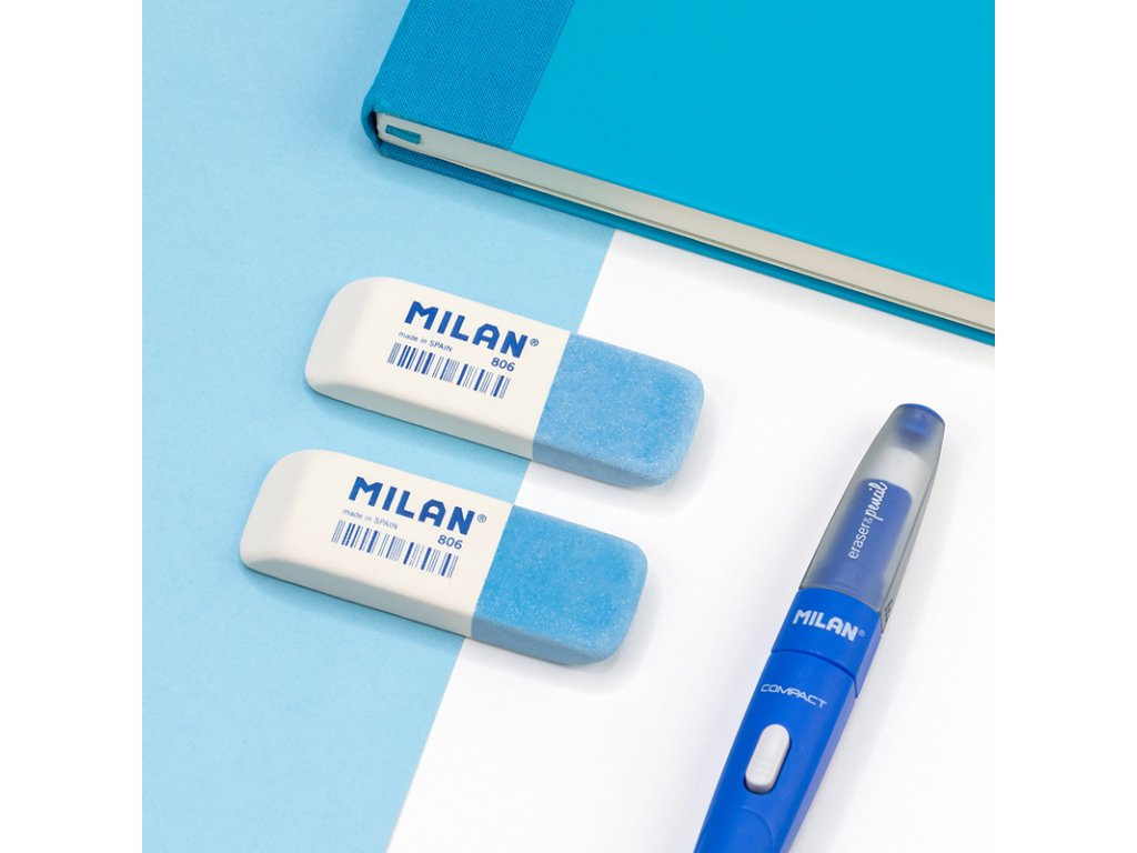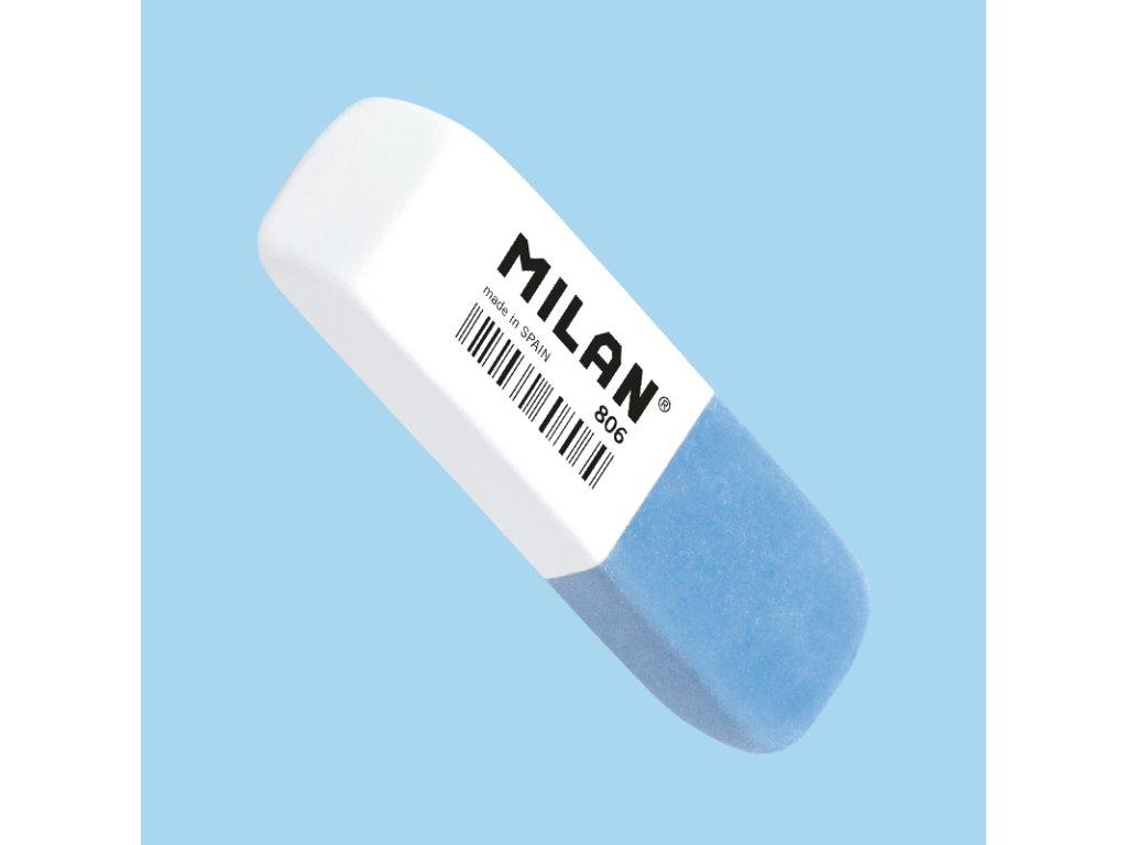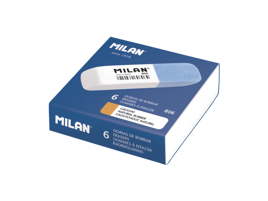 Guma MILAN 806 je dvojitá guma se zkosenými hranami ze syntetické gumy: pružnější a odolnější. Nabízí dvě silné mazací schopnosti: bílá pryž je pružná a dá se použít k vymazání široké škály grafitových tahů tužkou ze všech druhů papíru a modrá guma je abrazivní a má silnější mazací schopnost.Doplňkové parametry