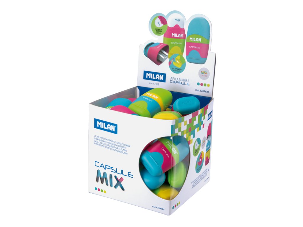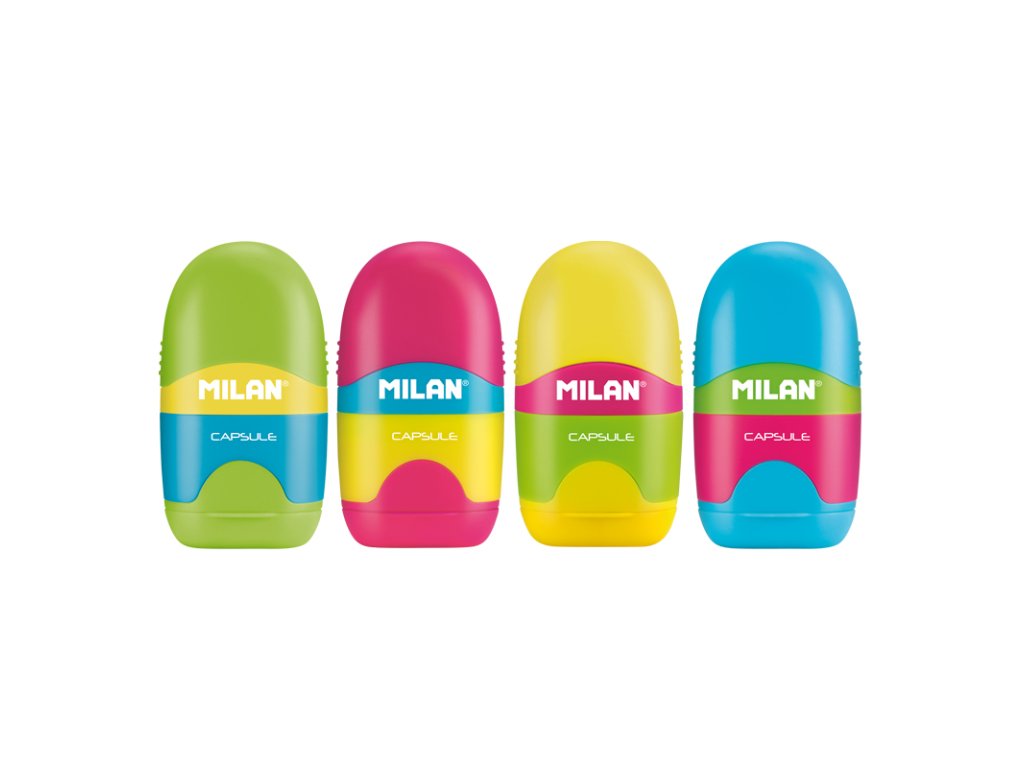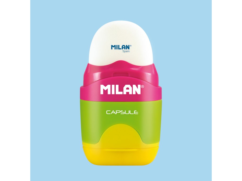 Kombinovaná guma a ořezávátko MILAN Capusle Mix se zásobníkem v jednom. Guma je schovaná pod víkem. Ostrá, odolná uhlíková čepel struhadla, se systémem který zabraňuje oddělení čepele od těla struhadla. Ideální pro školáky a studenty. Guma se dá dodatečně vyměnit za gumu MILAN 1012.Doplňkové parametry