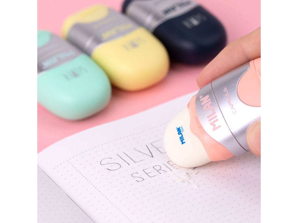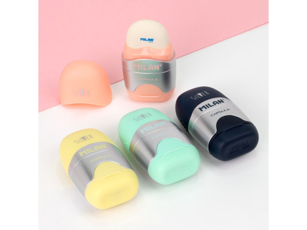 Guma a ořezávátko MILAN Capsule Silver se zásobníkem v jednom. Guma je uschována pod víkem. Ostrá, odolná uhlíková čepel struhadla, se systémem který zabraňuje oddělení ostří od ořezávátka. Ideální pro použití ve škole.Doplňkové parametry