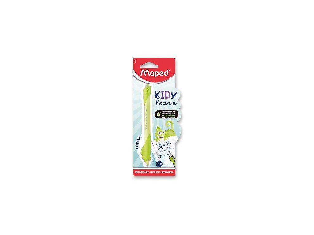 Gumovací pero Maped Kidy Learn Magic Chameleon v provedení chameleona s inkoustem, který lze snadno vymazat třením. Pero je navrženo pro podporu správného úchopu, má měkkou ergonomickou úchopovou zónu. Pero je znovu plnitelné a kompatibilní se standardními gumovacími náplněmi. Je vhodné pro praváky i leváky a pro děti od 6 let. Šíře hrotu 0,7 mm. - ergonomická úchopová zóna- otočný mechanismus- modrá barva náplněDoplňkové parametry