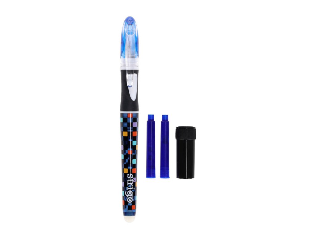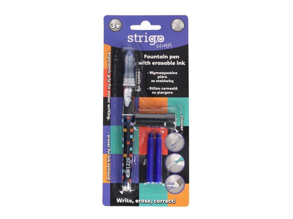 Plnící pero na bombičky, které lze gumovat. Pero má ergonomický úchop. Zabalené na blistru včetně 2 ks bombiček a čistítka hrotu. Vhodné pro praváky i leváky.Doplňkové parametry