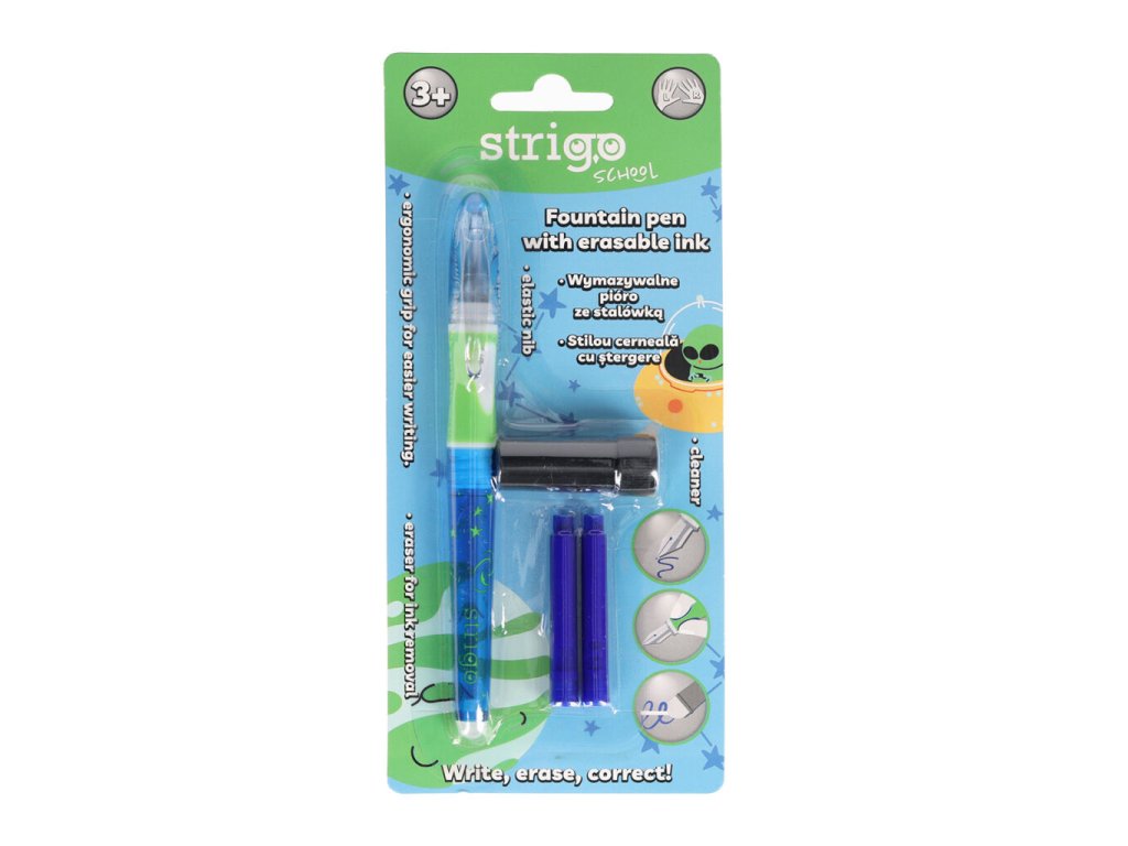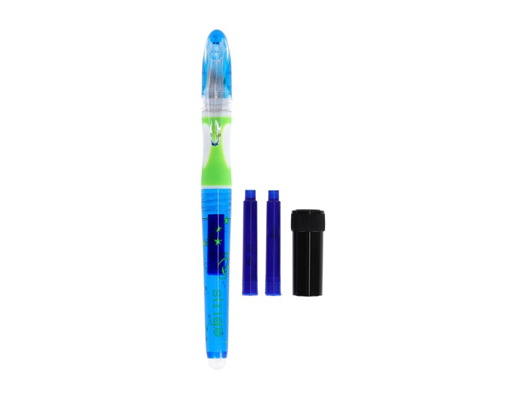 Plnící pero na bombičky, které lze gumovat. Pero má ergonomický úchop. Zabalené na blistru včetně 2 ks bombiček a čistítka hrotu. Vhodné pro praváky i leváky.Doplňkové parametry