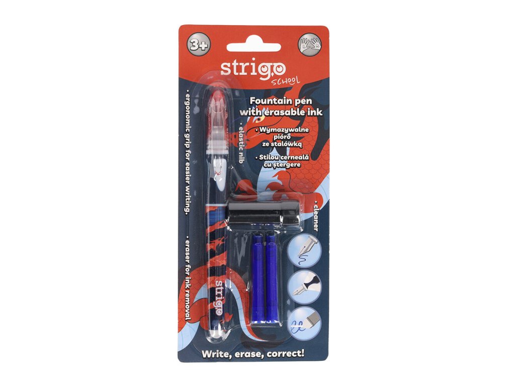Plnící pero na bombičky, které lze gumovat. Pero má ergonomický úchop. Zabalené na blistru včetně 2 ks bombiček a čistítka hrotu. Vhodné pro praváky i leváky.Doplňkové parametry