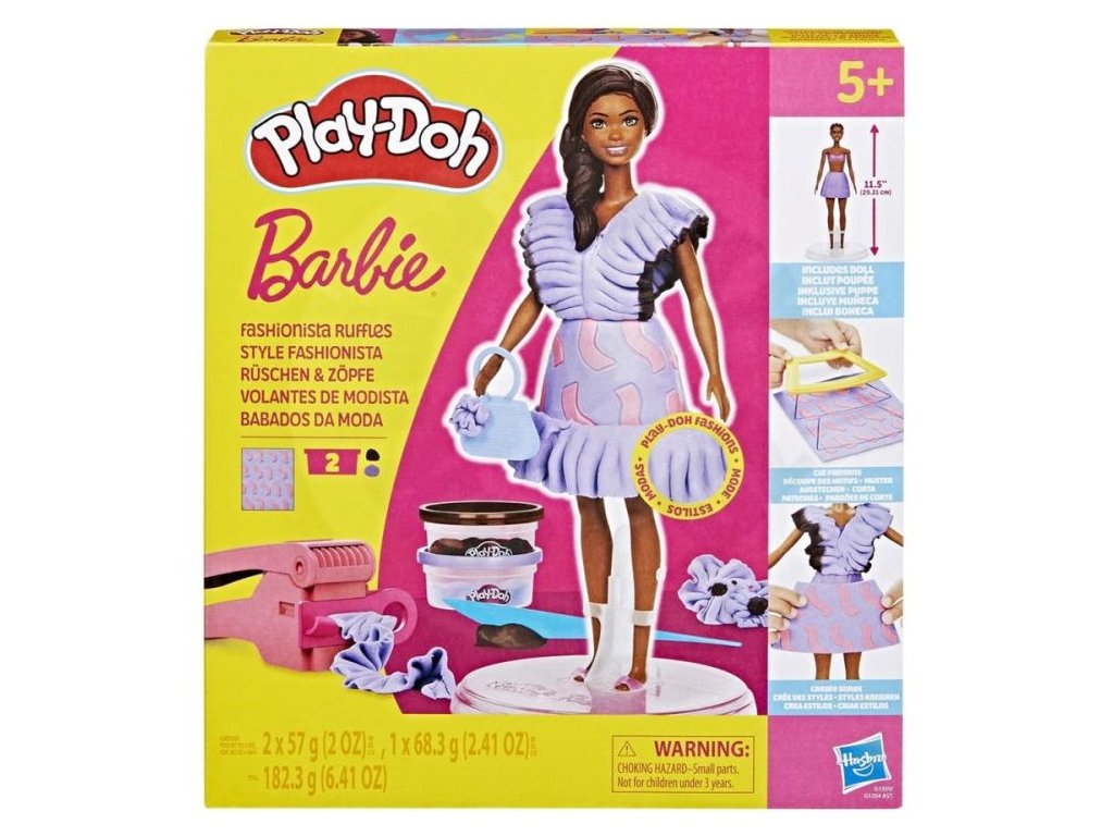 Vytvořte super roztomilé styly se sadou Play-Doh Barbie pro panenky. S touto kreativní sadou je výroba oblečení pro panenku Barbie snadná a zábavná. Jednoduše umístěte panenku na stojan, použijte vzorník a formičky Play-Doh k vystříhání šatů pro Barbie a oblečte ji těmi nejnápaditějšími způsoby. Vytvořte panence dva různé účesy z Play-Doh s formičkami na krátké a dlouhé vlasy nebo si vytvořte vlastní účesy ručně. Přidejte doplňky Barbie, jako je pásek a boty, a dotvořte její vzhled. Obsah sady: 1 x panenka, 1 x stojan pro panenku, 1 x 68,3 g plát modelovací hmoty, 2 x 57 g modelovací hmota, sada doplňků a formiček. Výška panenky 30 cm. Baleno v krabičce. Rozměry balení: 31,8 x 27,9 x 4,4 cm. Věk: 5+Doplňkové parametry