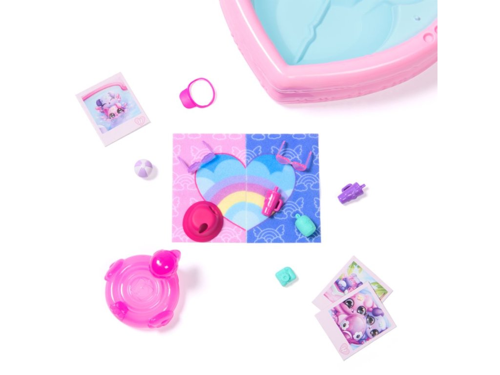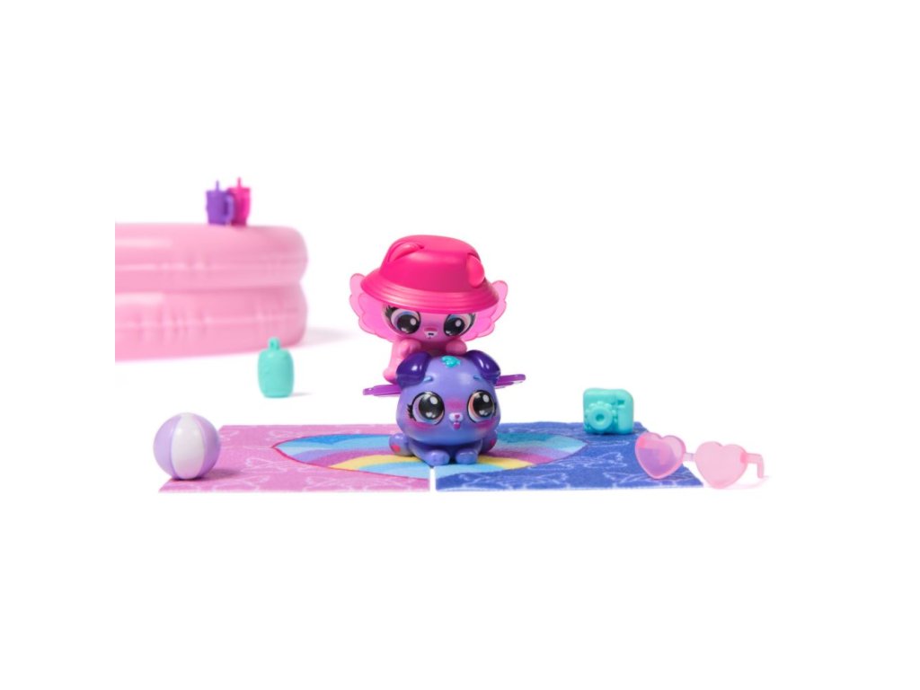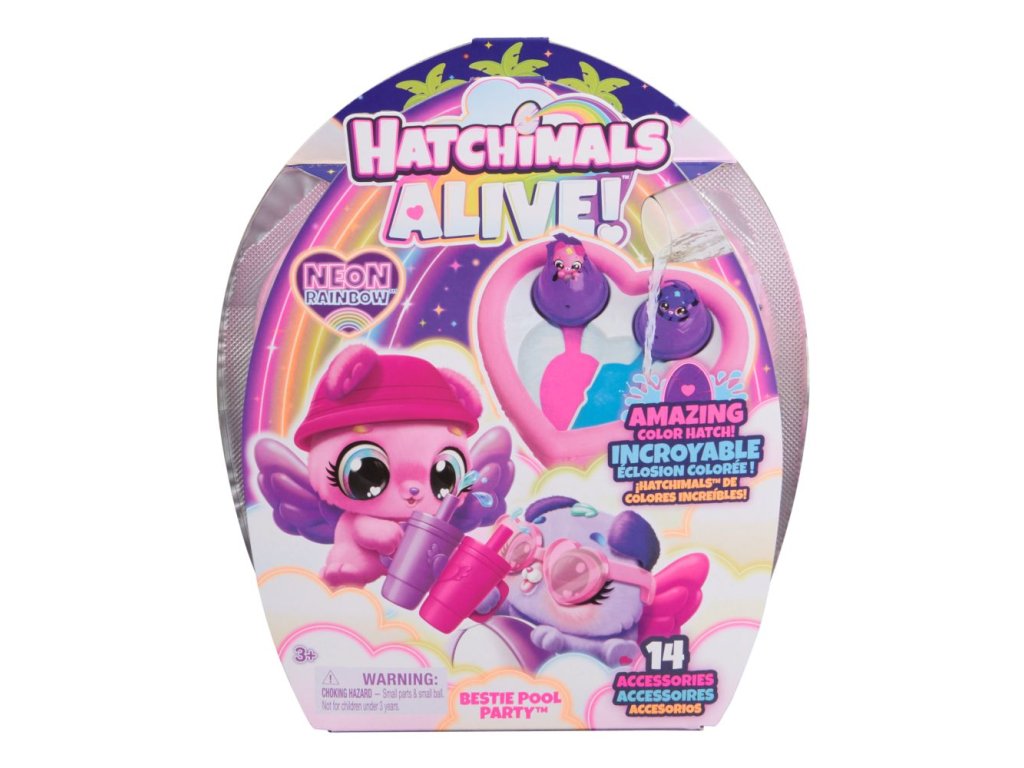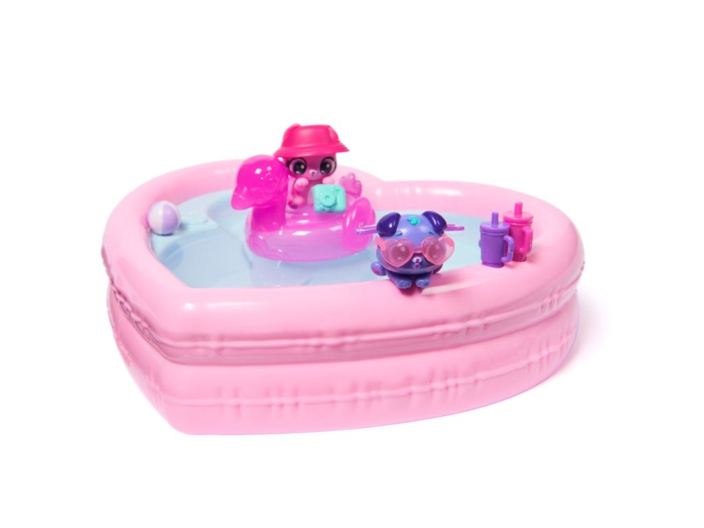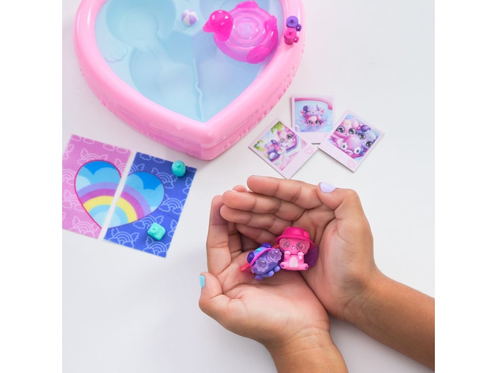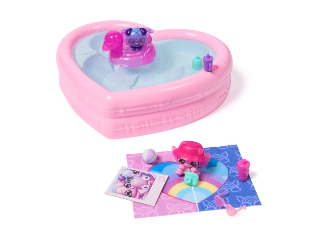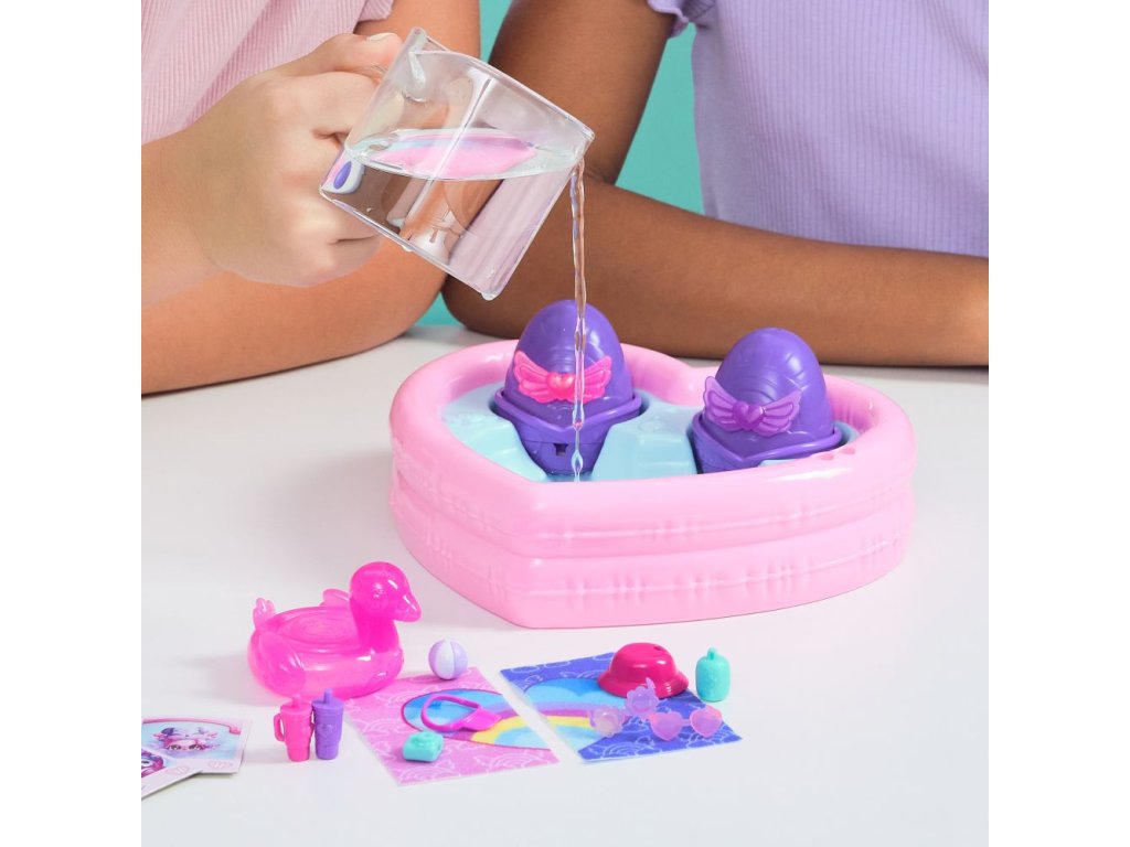 Zažijte bazénovou párty zvířátek Hatchimals! S vaší láskou a péčí neónově duhové Hatchimals ožívají s neónovými vajíčky, které se líhnou ve vodě a mění její barvu! Tato sada obsahuje 2 Hatchimals ve vejcích, bazének ve tvaru srdce a 14 doplňků. Před vylíhnutím si vyberte místo, které se snadno čistí a chraňte svou hrací plochu. Vejce vložte do bazénu, odstraňte křídla a pomalu naplňte srdíčka vodou – vaše postavy se začnou líhnout až obě strany srdce změní barvu! Po přidání většího množství vody se barvy smíchají do fialové a spojují vaše nejlepší kamarády na celý život! Objevte 2 Puppadees, která se dají naskládat do roztomilé pózy a spoustu doplňků pro dokonalou bazénovou party: plameňáka, plážový míč, sluneční brýle a další! Navíc má každá postava látkový ručník, který se spojí a vytvoří nejlepší srdce! Po hraní sadu důkladně osušte. Hračky s překvapením Hatchimals si zamilují všichni, kteří mají rádi sběratelské předměty, akční figurky, malé hračky, panenky a domečky pro panenky. Zábavný nápaditý dárek k narozeninám pro dívky i chlapce nebo velikonoční či vánoční dárečky a další! Přiveďte zvířátka Hatchimals k životu s neónově duhovou bazénovou párty zvířátek!Doplňkové parametry