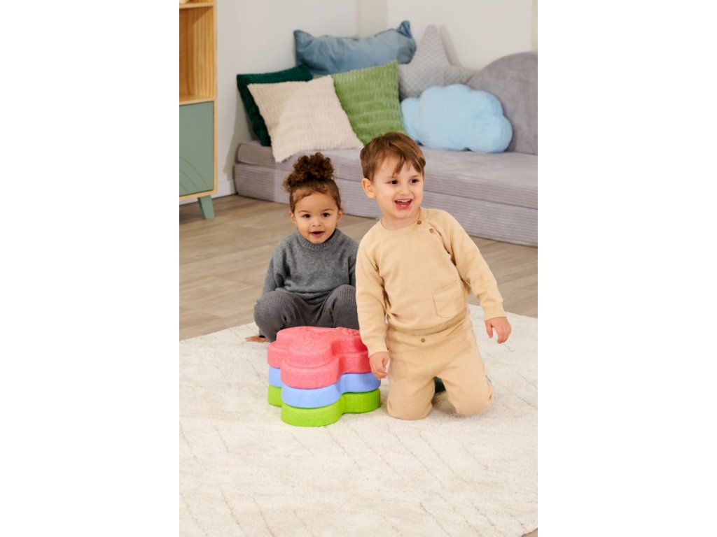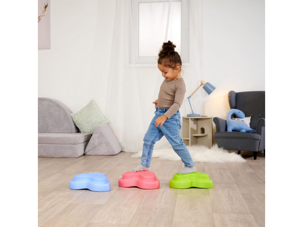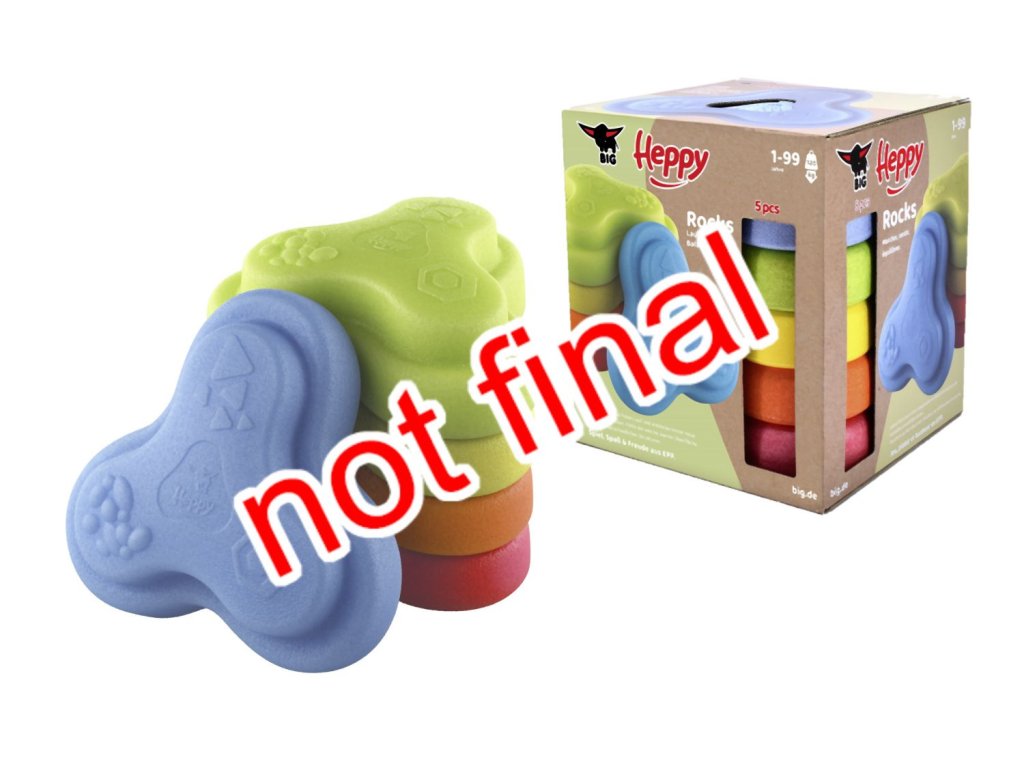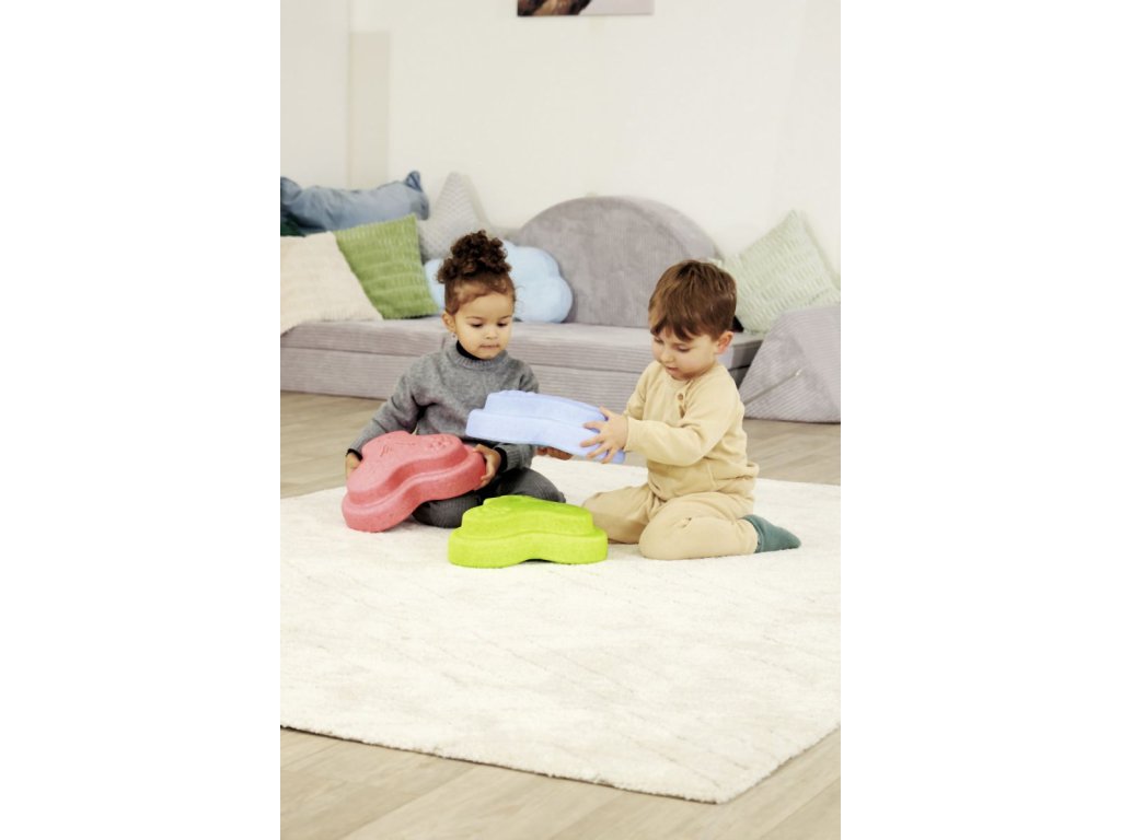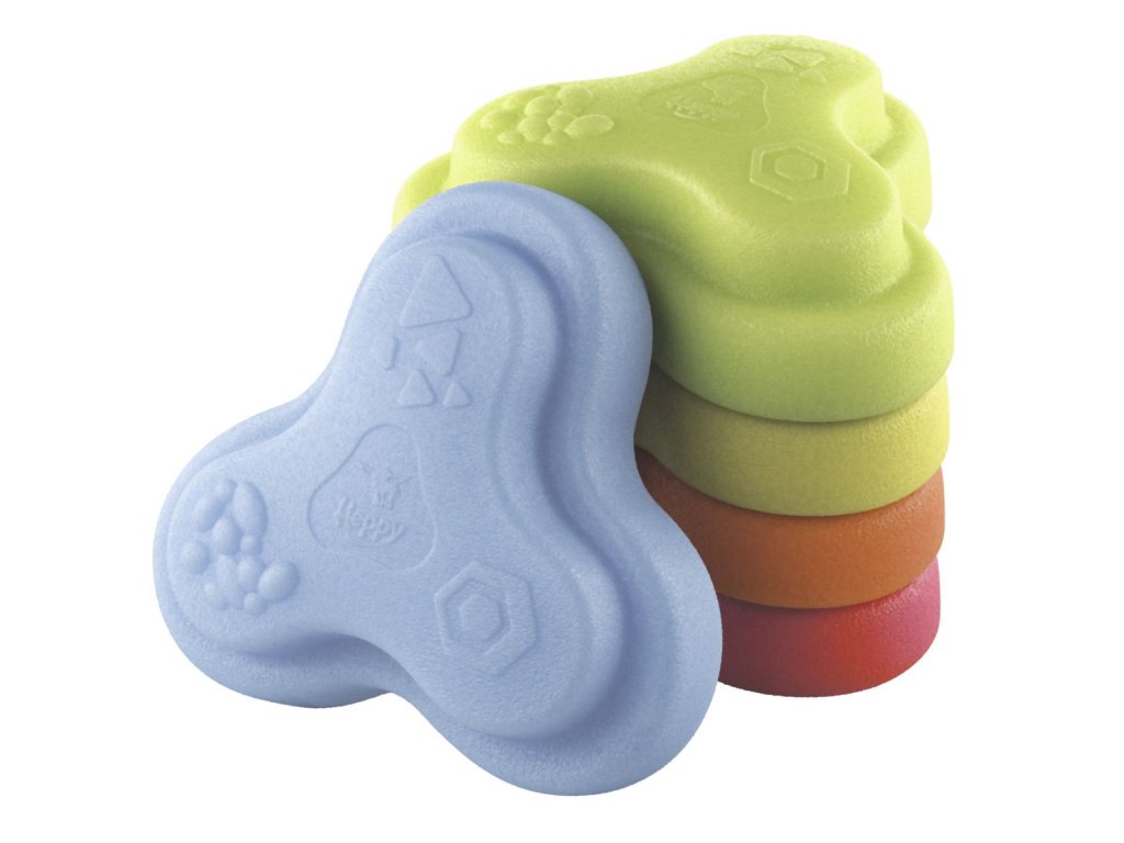 Sada 5 balančních nášlapných kamenů pro děti- v červené, modré, zelené, oranžové a žluté barvě - Měkké kostky se strukturovaným povrchem pro hmatovou hru a stavění. Tyto barevné hrací kameny byly speciálně vyvinuty pro batolata od 12 měsíců a hravou formou podporují smyslové vnímání, motorický vývoj a smysl pro rovnováhu. Vyrobeno z EPP: 90 % vzduchu, 10 % materiálu. Obzvláště robustní a extrémně lehké. Tři různé povrchové textury, kameny unesou zatížení až 120 kg. Díky svému materiálu jsou Heppy Rocks teplejší než jiné plastové hračky, snadno se čistí, jsou odolné vůči slinám a potu a ideální pro použití uvnitř i venku.Doplňkové parametry