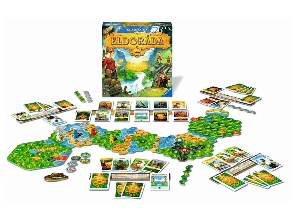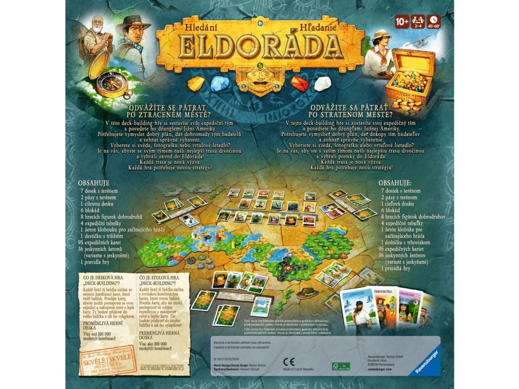 Odvážíte se pátrat po ztraceném městě? V této deck-building hře si sestavíte svůj expediční tým a povedete ho džunglemi Jižní Ameriky. Potřebujete vymyslet dobrý plán, dát dohromady tým badatelů a sehnat správné vybavení. Vyberete si zvěda, fotografku nebo vrtulové letadlo? Je na vás, abyste se svým týmem našli nejlepší trasu divočinou a vyhráli závod do Eldoráda. Každá trasa je nová výzva. Každá hra potřebuje novou strategii. Díky proměnlivé herní desce můžete vytvořit více než 100 000 herních kombinací. Obsahuje: 7 desek s terénem, 2 pásy s terénem, 1 cílovou desku, 6 blokád, 8 hracích figurek dobrodruhů, 4 expediční tabulky, 1 žeton klobouku pro začínajícího hráče, 1 destičku s tržištěm, 95 expedičních karet, 36 jeskynních žetonů (varianta s jeskyněmi), 1 pravidla hryDoplňkové parametry