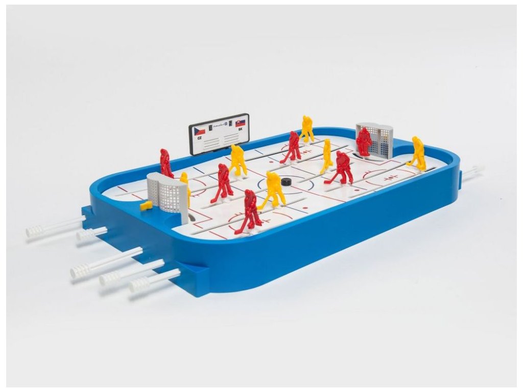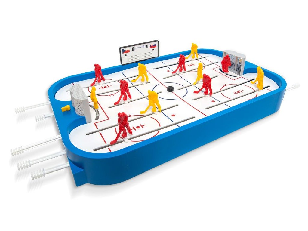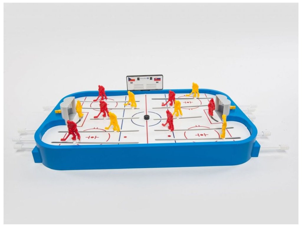 Stolní lední hokej. Obsahuje dva kompletní týmy, náhradní hráče, náhradní díly a ukazatel skóre. Rozměry hrací plochy jsou 50x30cm. Hra určená pro dva hráče. Vhodné pro děti od 3 let.Doplňkové parametry
