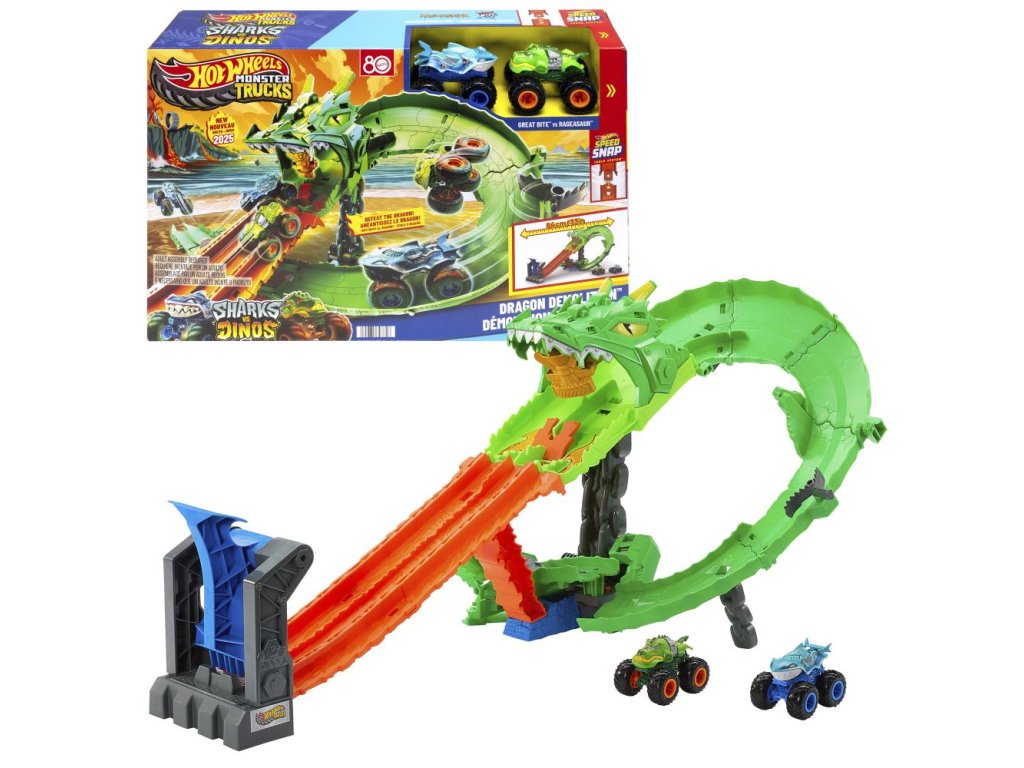 Závod začíná! Hot Wheels Monster Truck se utkávají v epickém souboji žraloci versus dinosauři, aby porazili svého úhlavního nepřítele – kybernetického draka v herním setu Dračí zkáza. Naložte oba přiložené monster trucky do dvojitého odpalovače a vystřelte je současně přímo do dračí tlamy. Čeká je divoká jízda skrz jeho tělo, kde rozhoduje motorová pila jako přeřazovač, který náhodně určí jeden ze tří výsledků – zadrží oba monster trucky, shodí jednoho z trati nebo propustí oba k vítězství. Jakmile drak padne, děti můžou znovu odstartovat útok a získat trofej! Součástí jsou dva monster trucky Hot Wheels v měřítku 1:64. Barvy a vzhled výrobku se mohou lišit.Doplňkové parametry