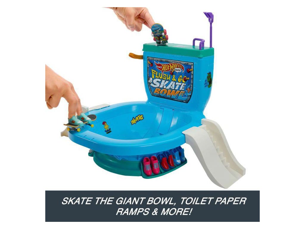 Stisknutím páčky na toaletní míse Hot Wheels® Skate parku spláchněte fingerboard a začněte trénovat! Tento set má úžasné skate povrchy včetně obrovské mísy, rampy z toaletního papíru, nájezdové rampy a grindové dráhy, a navíc úložný prostor pro 4 fingerboardy a 6 párů bot. Součástí balení je jedno exkluzivní prkno a jeden pár odnímatelných skate bot.Doplňkové parametry