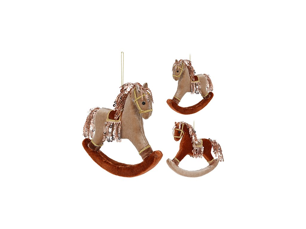 Houpací koník z příjemného materiálu na dotek se zlatým lemováním a světle růžovými flitry jako dekorace na zavěšení.