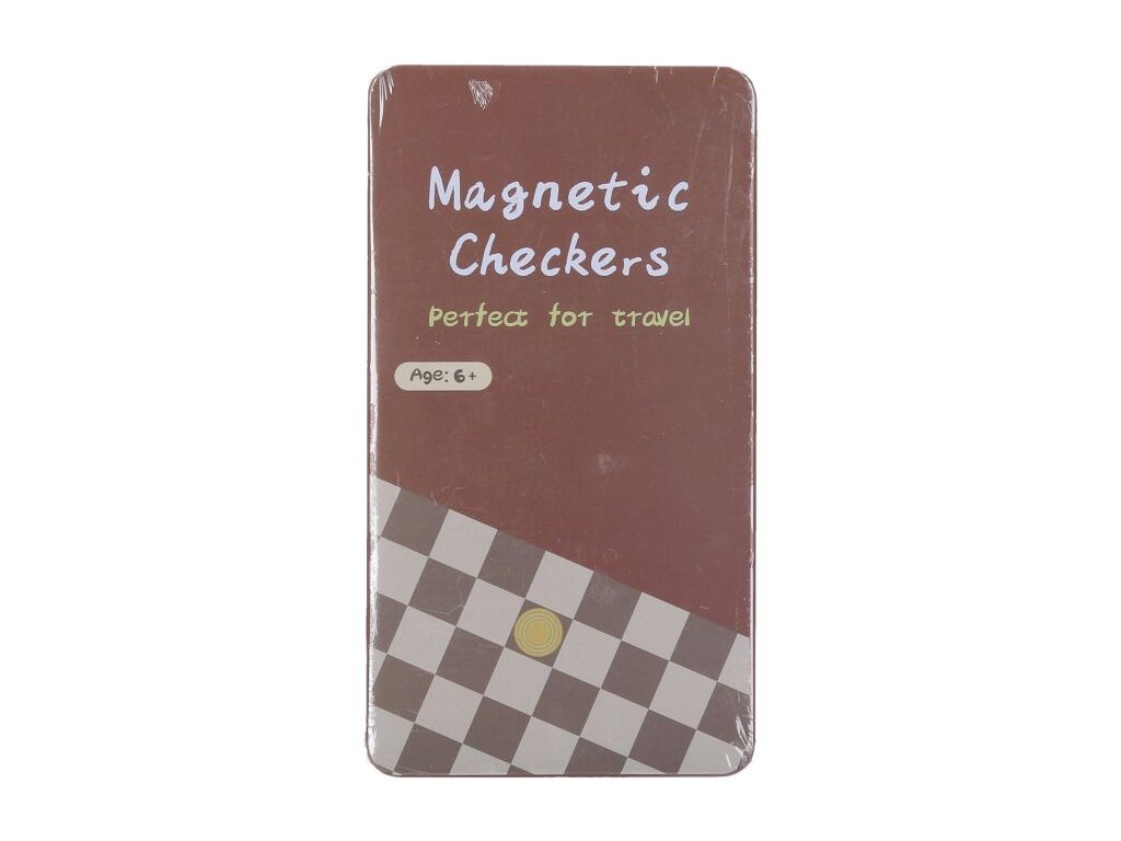 Hra dáma magnetická cestovní. Rozměry pouzdra 10x18,5 cm. Plechové pouzdro slouží po otevření jako hrací deska. Figurky jsou magnetické.Doplňkové parametry