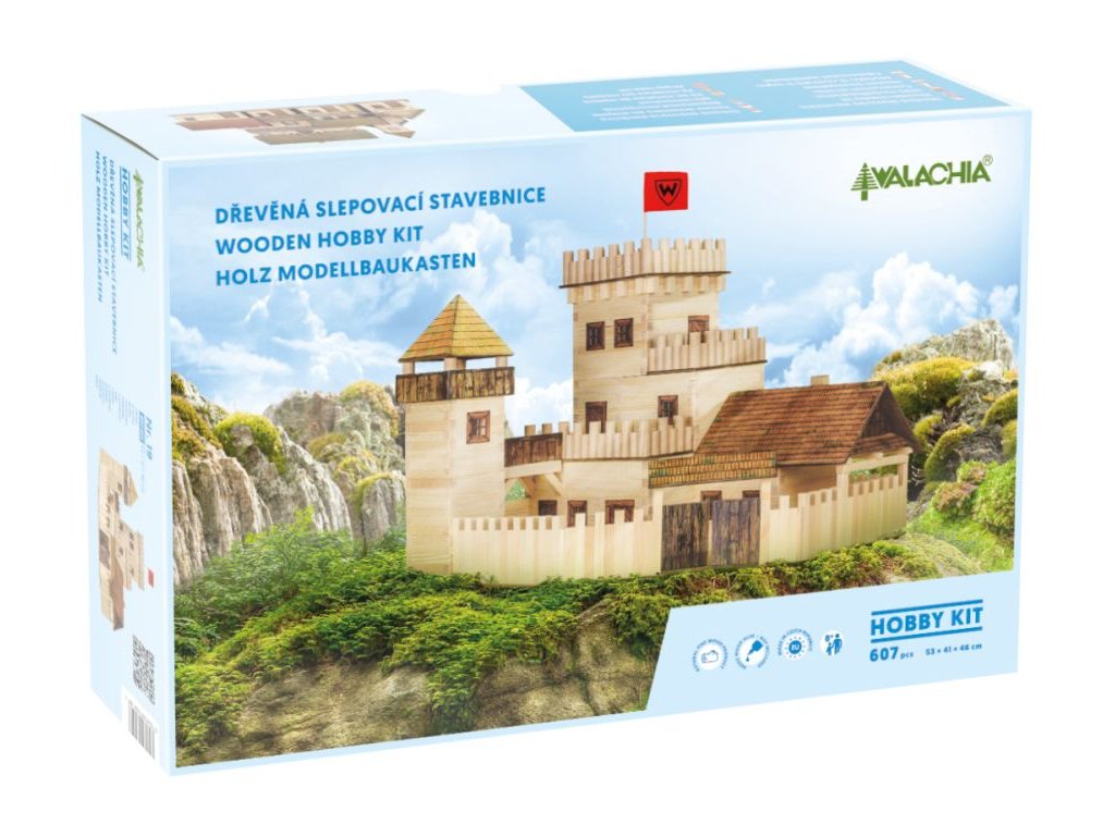 Dřevěná stavebnice Walachia ke slepení - Hrad. Slepovací stavebnice Walachia jsou dřevěné modely domečků a staveb z Valašského kraje v měřítku 1:32. Základem jsou dřevěné hranolky 9x9 mm a k tomu jsou v sadě vždy všechny papírové doplňky - okna, dveře, střešní části atd. Pro lepení se používá lepidlo Herkules, není však součástí stavebnice. Přiložený je montážní návod a malé kapitoly z historie lidové architektury. Níže je označení obtížnosti číslem 1 - 5, přičemž 1 je nejlehčí. Počet dílů stavebnice: 607. Rozměry: 53x41x46 cm. Obtížnost: 4Doplňkové parametry