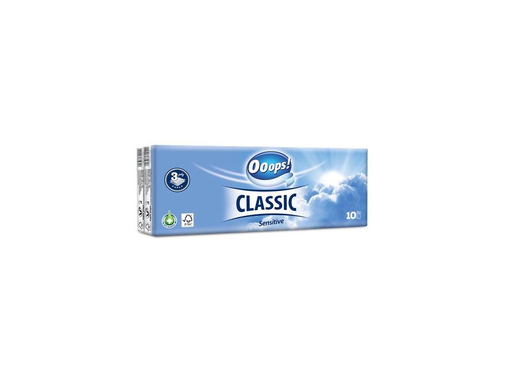 Hygienické kapesníky Ooops! Classic Sensitive 3-vrstvé. Materiál: 100% celulóza. V 1 balení se nachází 10 ks kapesníků.Doplňkové parametry