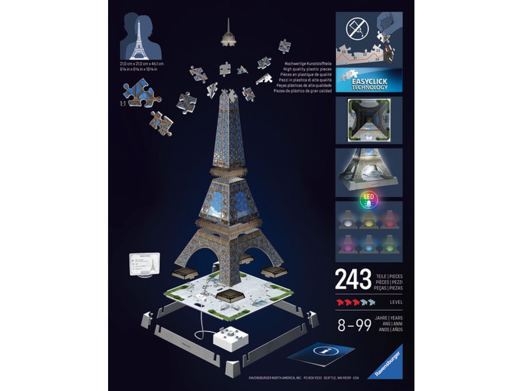 Postavte si osvětlený model Eiffelovy věže z Iconics edice pomocí stabilních plastových dílků a nechte ho rozzářit pomocí LED světla. Více možností v nastavení světla.Doplňkové parametry