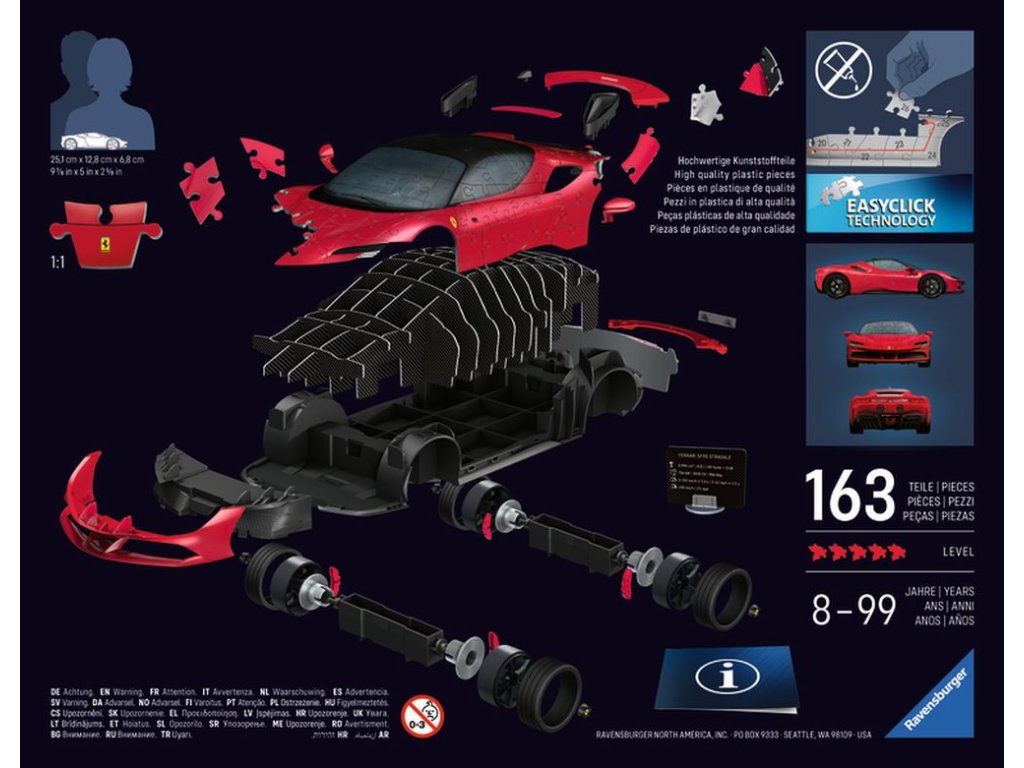 Zažijte jedinečnou kombinaci skládání a stavění a vytvořte si působivý model jednoho z nejikoničtějších vozů Ferrari SF 90 Stradale v nepřehlédnutelné červené barvě ze 108 dílků. Kvalitní, plastové puzzle s technologií Easyclick. Bez nutnosti lepení! S funkčními otáčecími koly. Puzzle obsahuje pevnou vnitřní konstrukci pro zajištění maximální stability složeného modelu.Doplňkové parametry