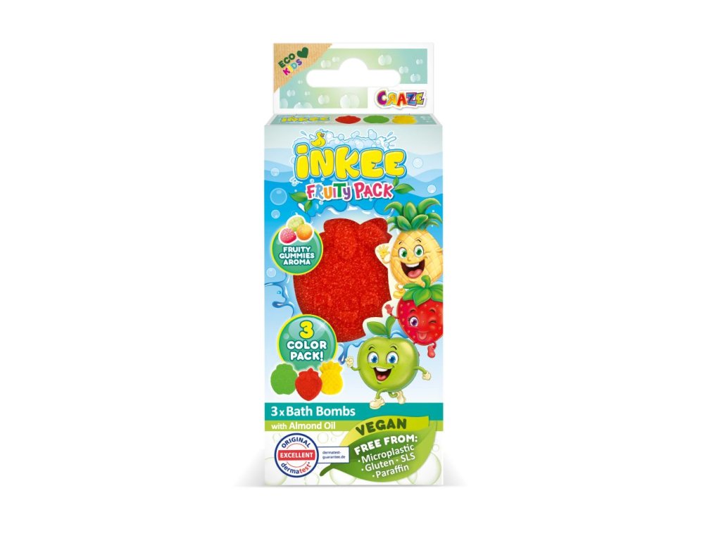 „Balení bomb do koupele (3 x 15 g) se třemi různými tvary ovoce a třemi různými barvami: Jablko - zelené; Jahoda - červená; Ananas - žlutá. S jojobovým olejem a vůní Fruity Gummies. Vegan. Microplastic, Gluten, SLS, Paraffin free. Dermo test!Děti 3+.Doplňkové parametry