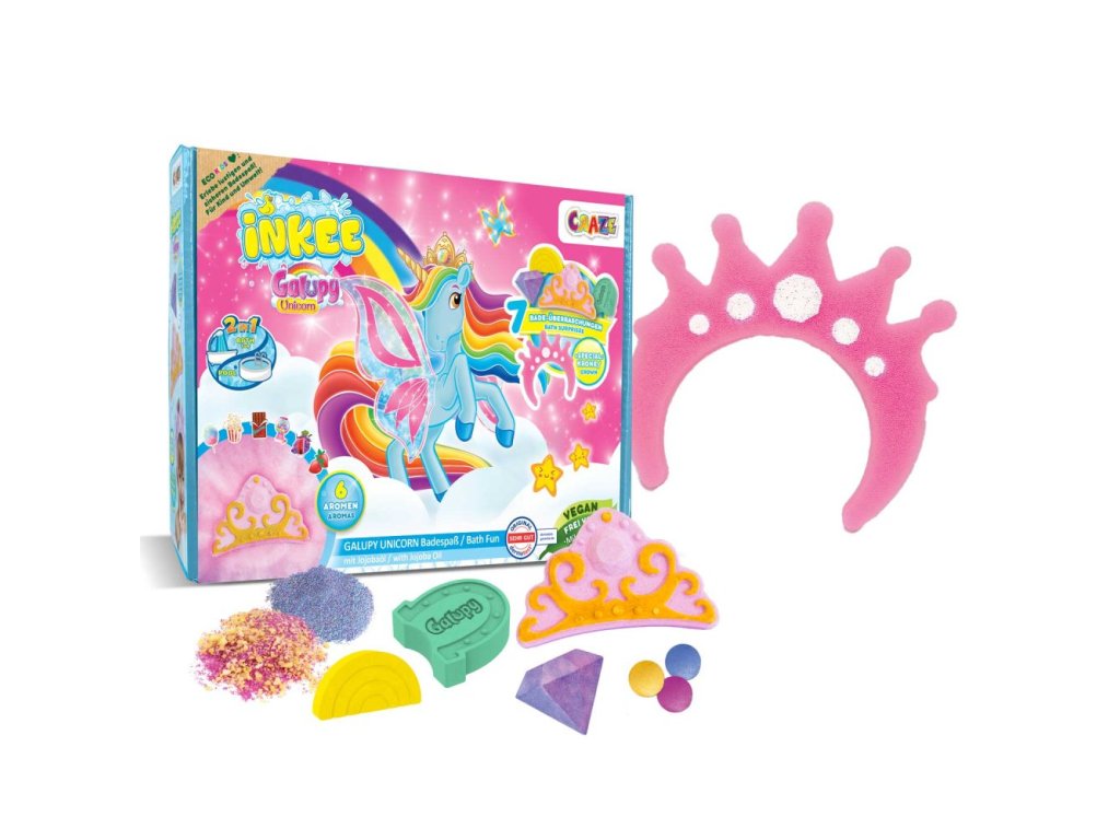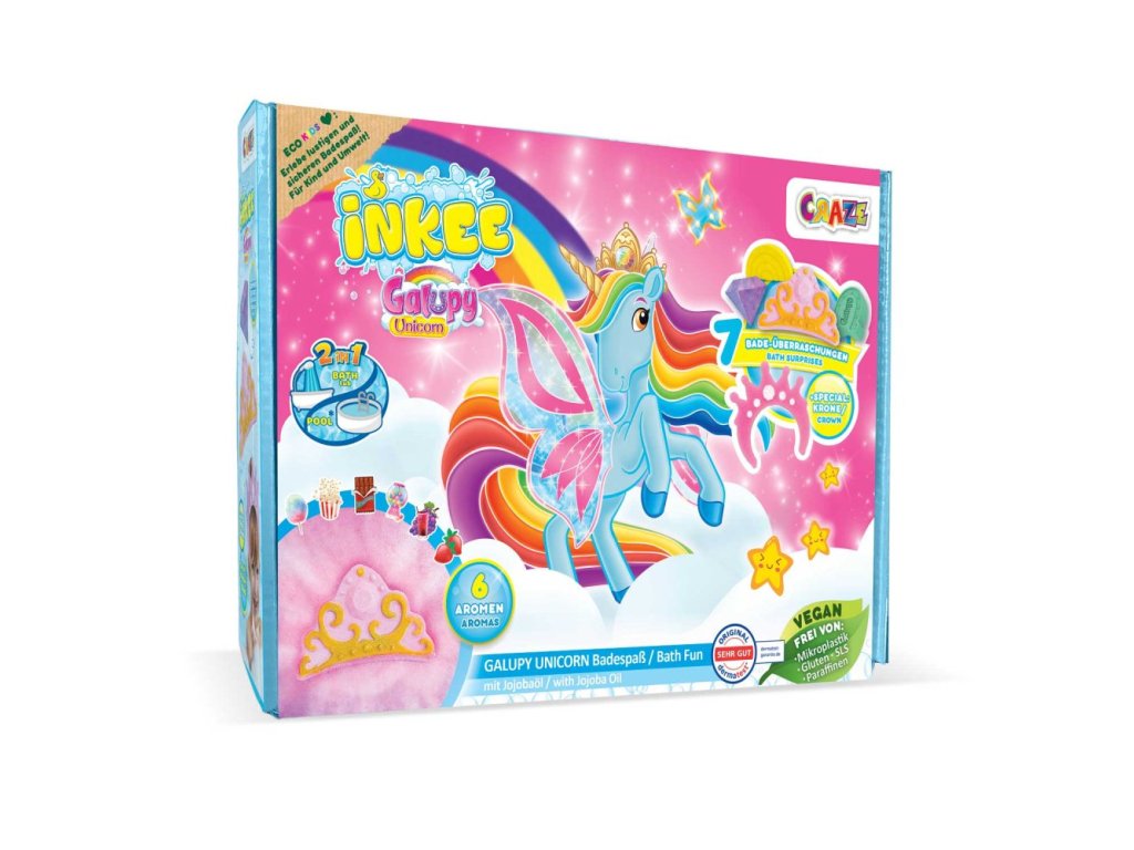 Tato speciální dárková krabička INKEE Galupy Unicorn je skutečným potěšením pro všechny fanoušky Galupy, kteří milují relaxační a barevný zážitek z koupání. Krabička obsahuje 7 jedinečných předmětů včetně 4 různých bomb do koupele, koupelového prachu, prášků, kapek do koupele a roztomilého doplňku.Dárková krabička INKEE Galupy Unicorn nabízí širokou škálu efektů včetně plovoucích bomb do koupele, perlivých bomb do koupele, pěnivého prachu do koupele a praskacích solí. Přiložená houbová korunka poskytuje další zábavu z koupání.Tato krabička obsahuje receptury, které nejen nabízejí zářivou barevnou paletu, ale jsou také obohaceny o jojobový olej, aby byla vaše pokožka jemná a pružná. Každá receptura byla pečlivě vyvinuta tak, aby poskytovala jedinečný zážitek z koupání.Doplňkové parametry