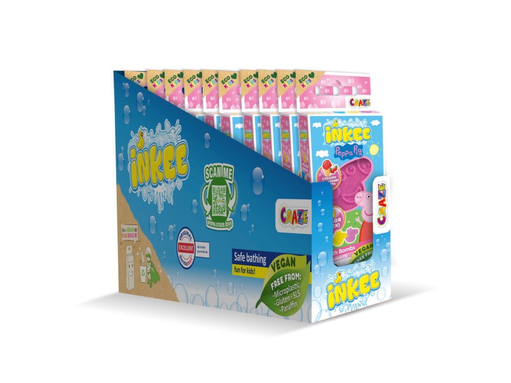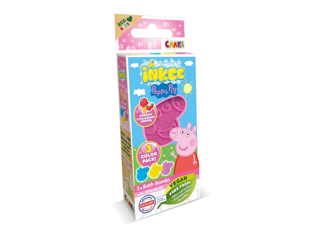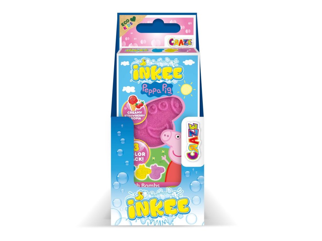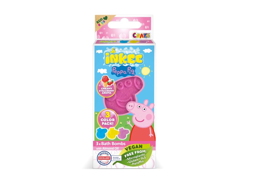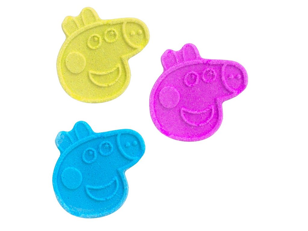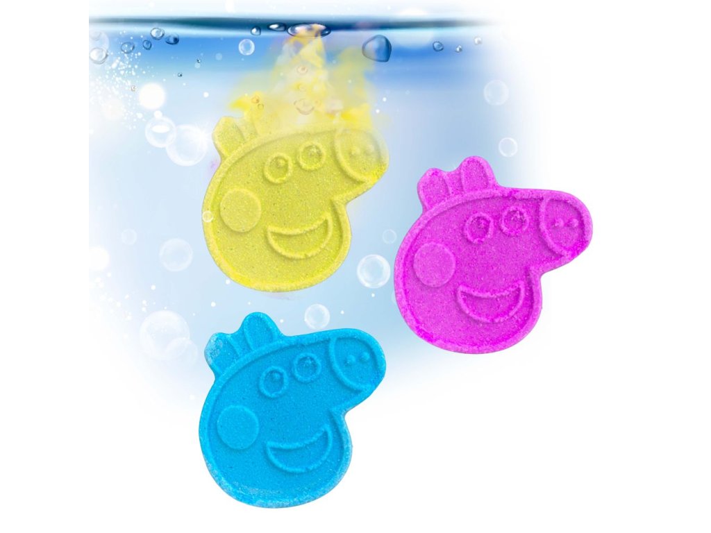 Balení bomb do koupele (3 x 15 g) s tvarem obličeje prasátka Peppa a 3 různými barvami (modrá, žlutá a růžová). S mandlovým olejem a vůní jahod.Doplňkové parametry