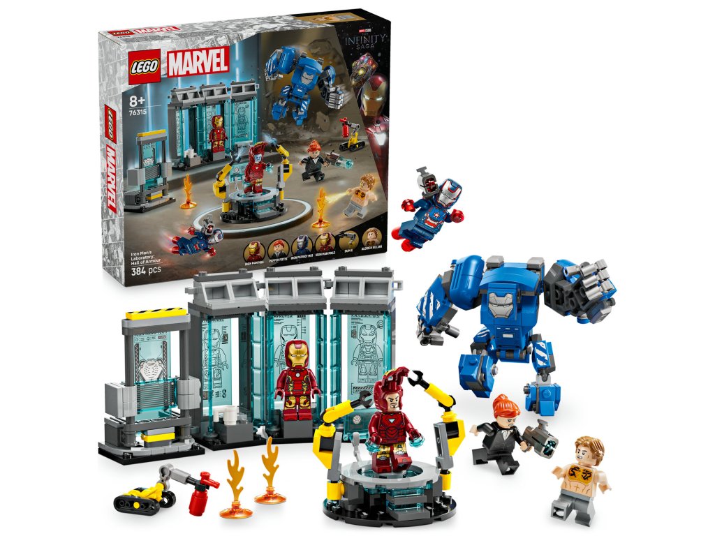 Stavebnice Iron Manova laboratoř: Síň brnění (76315) zavede malé superhrdiny a fanoušky filmů Marvel Avengers do Iron Manovy kultovní laboratoře. Tato dětská stavebnice je plná figurek LEGO® | Marvel a skvělých funkcí, které inspirují k nápaditým dobrodružstvím a představuje ideální dárek pro kluky a holky od 8 let. Tato stavebnice LEGO | Marvel obsahuje 3 sady brnění a 3 minifigurky brnění Iron Mana: MK1, MK43 a MK6. Stavebnici doplňují minifigurky Pepper Pottsové a padoucha Aldricha Killiana, sestavitelný robot Dum-E a velké robotické brnění Igor Iron Man MK3 s pohyblivými pažemi a nohama a kokpitem s místem pro minifigurku. Mezi další funkce stavebnice patří plošina na údržbu se 2 robotickými rameny a velkým skenovacím zařízením. Nechybí hasicí přístroj a 2 ohnivé dílky a 2 vystřelovače na akční souboje. Pro ještě větší digitální zábavu si stavitelé můžou přibližovat a otáčet modely ve 3D a sledovat svůj pokrok pomocí zábavné a intuitivní aplikace LEGO Builder. Model obsahuje 384 dílků.Doplňkové parametry