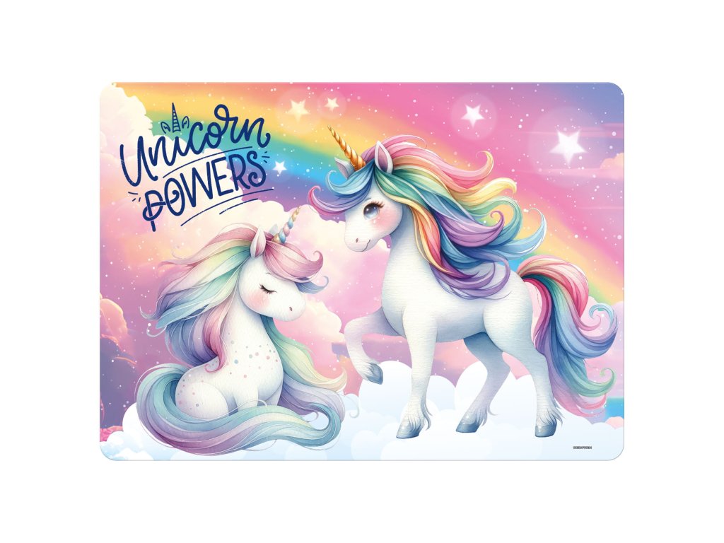 Jídelní podložka s motivem jednorožců, která je díky své velikosti a snadné omyvatelnosti dekorativní, ale také velice praktická. Vhodná i na malování, jako podložka na stůl. Materiál: lehce otíratelný plast. Rozměry: 40 x 29 cm, vhodná pro děti od 3 let.Doplňkové parametry