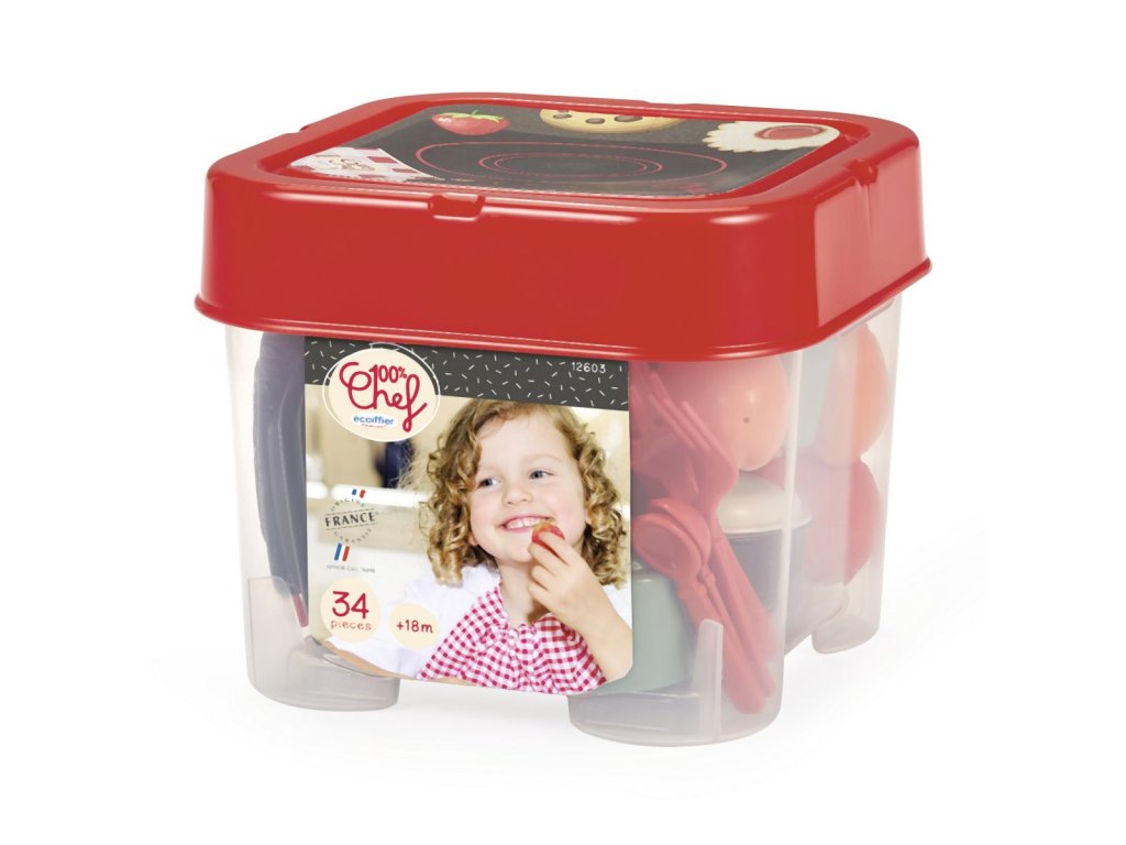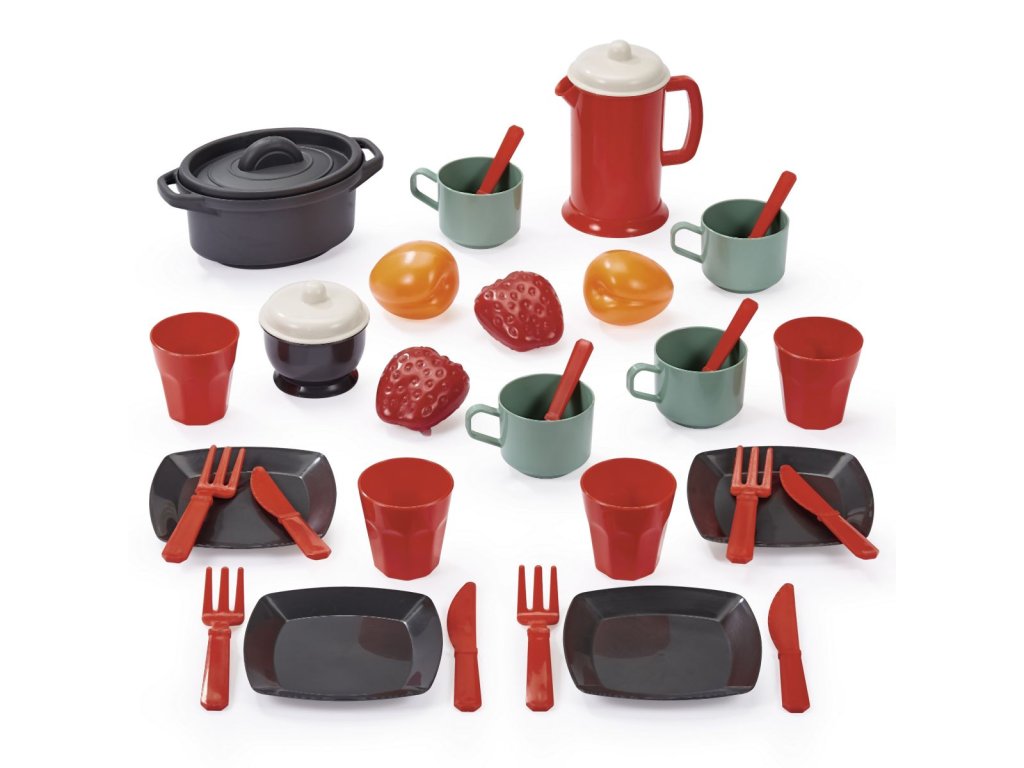 Jídelní set obsahuje vše potřebné pro nachystání pohoštění, vč. nádobí. 4 talíře, sada příborů, pohárky, hrníčky, konvička s víčkem, hrnec s víkem, ovoce a další.Doplňkové parametry