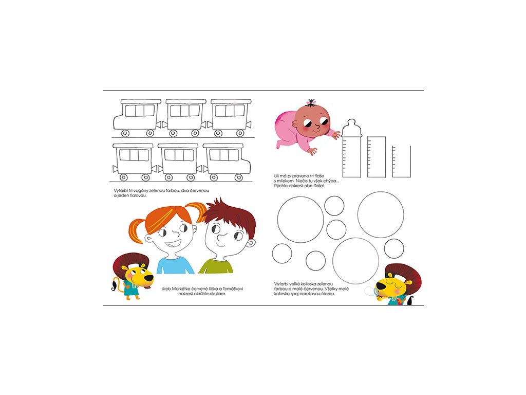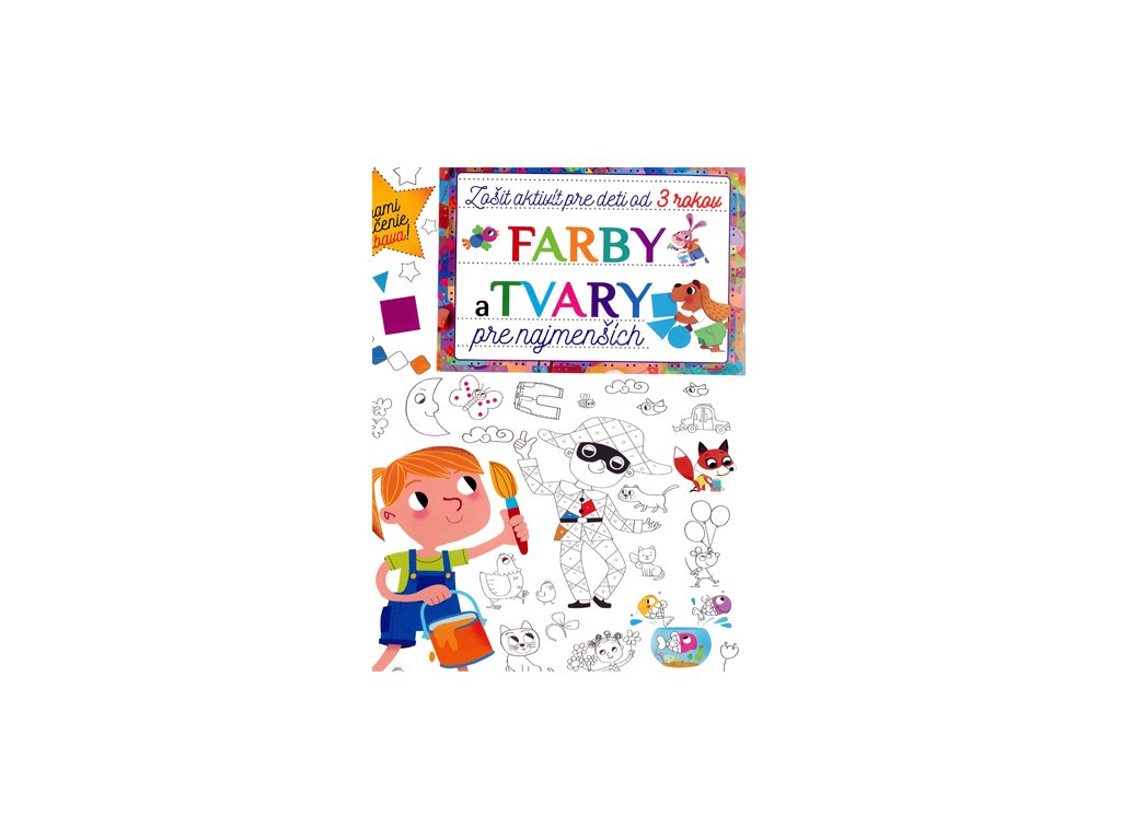 Sešit aktivit pro děti od 3 let - Barvy a tvary pro nejmenší. Obsahuje 32 stran plných nejrozmanitějších úloh k procvičování barev a tvarů. Děti se nejenže zábavným způsobem učí mluvit jednotlivé barvy a tvary, ale procvičují si i logické myšlení, a mohou si dokonce vybarvit obrázky nebo doplnit příběh podle vlastní fantazie. Knížka plná aktivit, bohatě ilustrovaná veselými obrázky, bude zkrátka pro předškoláky tím pravým pomocníkem.Doplňkové parametry
