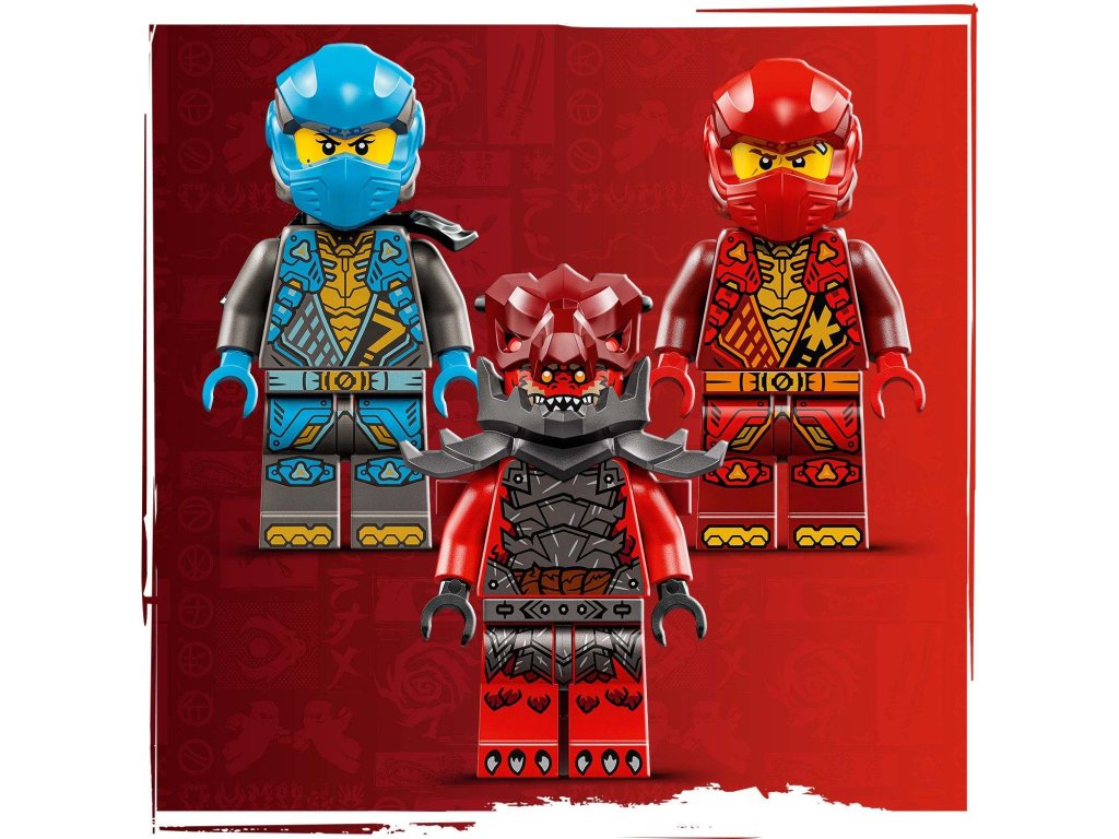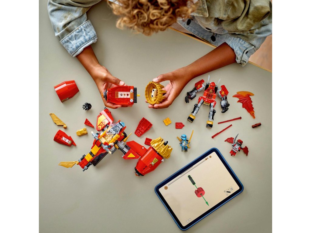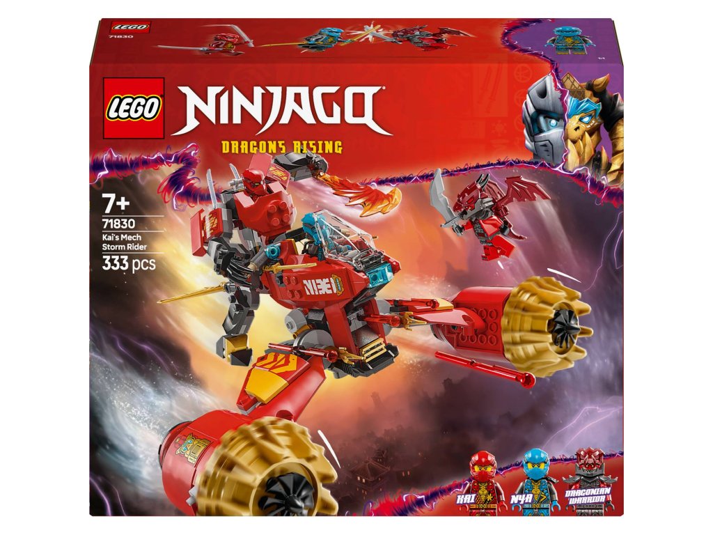 S kombinovanou nindžovskou stavebnicí Kaiův bouřný jezdec a robot (71830) si kluci a holky od 7 let připomenou napínavé scény ze 3. řady televizního seriálu NINJAGO® Dračí povstání. Děti si můžou s velkou akční stavebnicí hrát a poté ji rozdělit na 2 menší vozidla: Kaiova robota s pohyblivou hlavou, rukama a nohama, kokpitem a velkou bouřnou čepelí a Nyinu létající motorku s kokpitem, pohyblivými křídly a 2 pružinovými vystřelovači. Tato stavebnice s nindžovským vozidlem obsahuje 3 minifigurky NINJAGO: Kaie vyzbrojeného 2 křišťálovými katanami, Nyu se 2 zlatými katanami a zlotřilého dračího bojovníka s vlastním mečem, se kterými si děti užijí napínavé bitvy. V dalších stavebnicích z řady LEGO® NINJAGO se sestavitelnými hračkami s nindžovskou tematikou najdete draky, vozidla a chrámy a fanoušci si užijí hodiny zábavného hraní se svými oblíbenými hrdiny. Aplikace LEGO Builder vám a vašemu dítěti ukáže snadnou a intuitivní cestu stavitelským dobrodružstvím pro skládání nindžovského modelu.Doplňkové parametry
