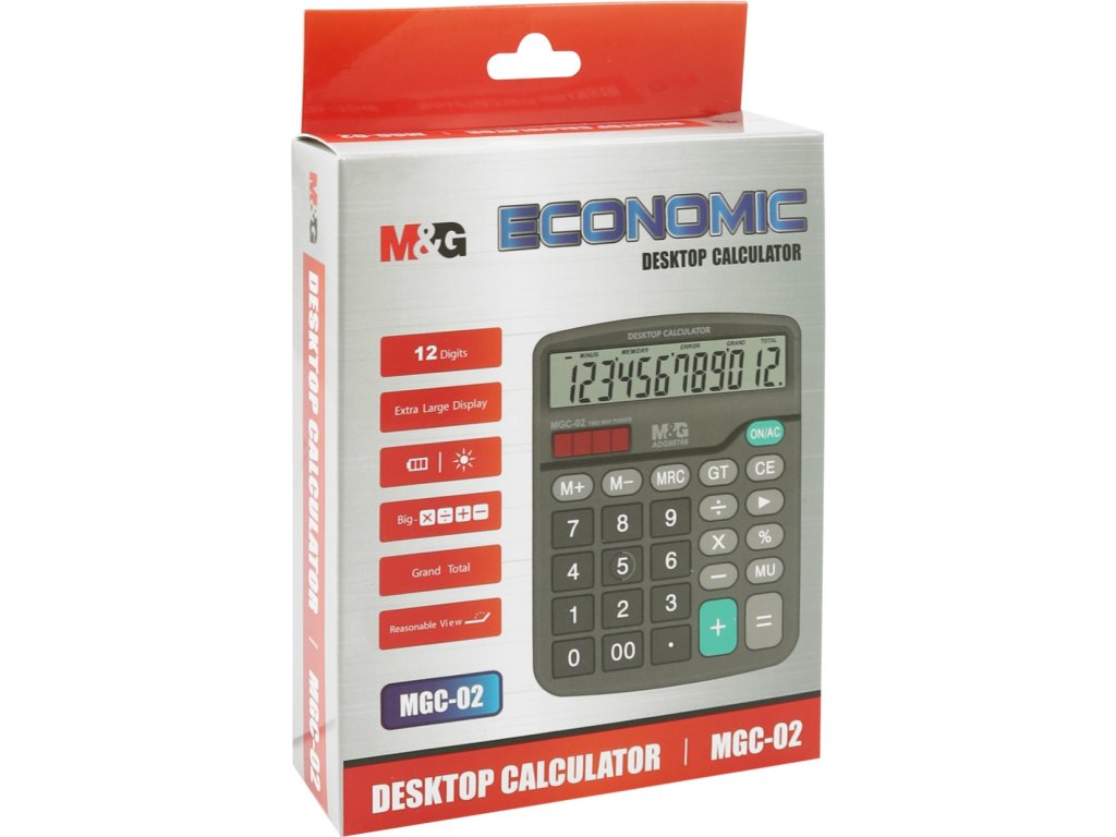 Kalkulačka M&G stolová MGC-02, 12-místná, ADG98766 20ks/karton Cena za 1ks Stolní kalkulačka Economic s velkým 12 ciferným nakloněným LCD displejem. Duální napájaní (solární se záložní batérií, která je součástí balení). Kalkulačka disponuje základními funkcemi jako je zápis do paměti, tlačitko s dvojitou nulou, korekční tlačítko. Automatické vypnutí, když do 6 minut nevykonáte žádnou činnost.Doplňkové parametry