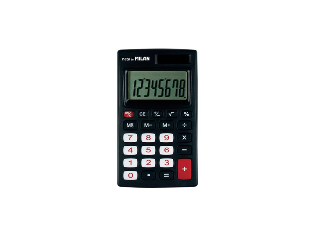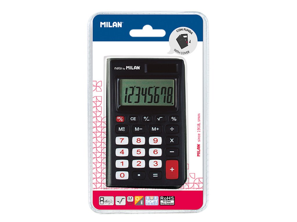 Kapesní 8-místná kalkulačka MILAN 150208 v ochranném obalu. Kalkulačka má kumulovanou paměť výsledků a výpočet odmocniny. Kalkulačka má měkké gumové tlačítka a duální napájení: 1,5 V baterie + solární panel. Černá kalkulačka s červenými detaily.Doplňkové parametry