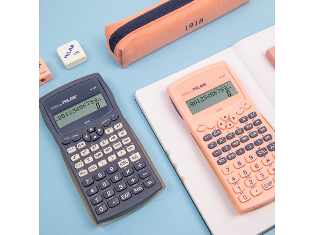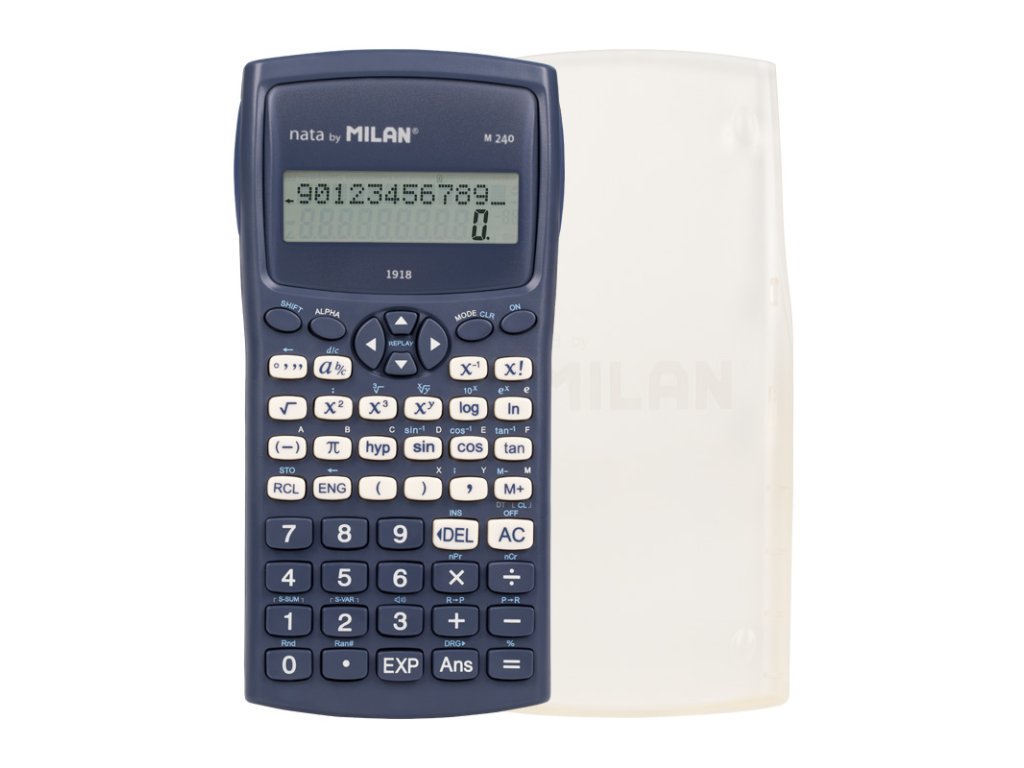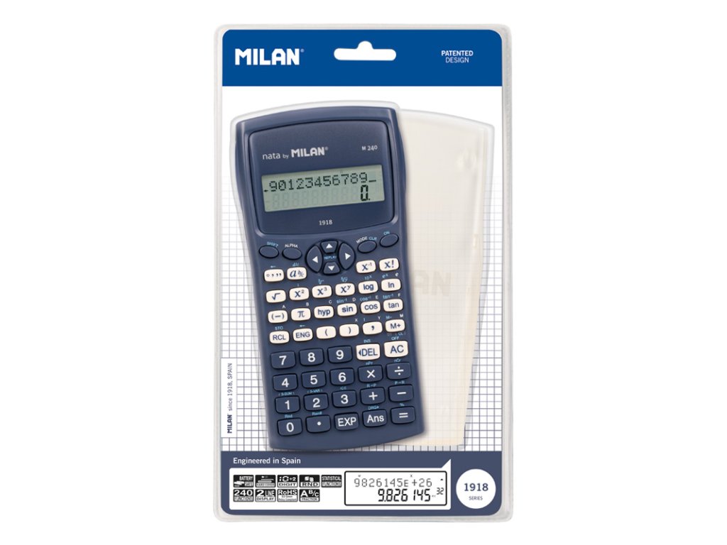 Vědecká kalkulačka MILAN s 2-řádkovým displejem, (10 + 2 číslice). Napájení zajišťuje 2x AAA baterie (jsou součástí). 240 integrovaných funkcí včetně 124 vědeckých funkcí. Trigonometrické funkce, parabolické a hyperbolické funkce a výpočet až 6 různých typů regrese; paměť na ukládání průměrů. Automatický výpočet zlomků, kurzorové klávesy pro pohyb v nabídkách, struktura závorek umožňující až 24 úrovní, paměť pro ukládání proměnných, výpočty pomocí stupňů, stupňů a radiánů.Doplňkové parametry