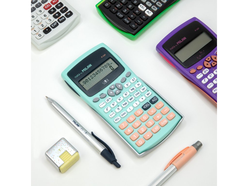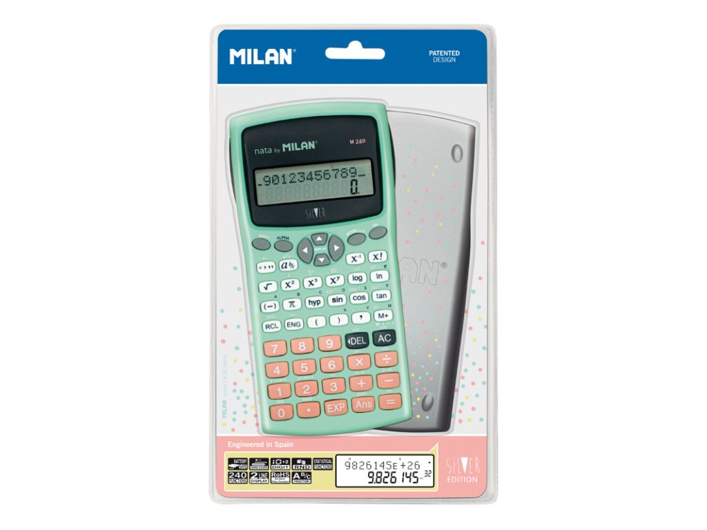 Vědecká kalkulačka MILAN s 2-řádkovým displejem, 10+2 místt. Napájaní zabazpečuje 2x AAA batéria. Integrál, trigornometrické funkce, logaritmy. Součástí balení je ochranný kryt. Rozměry 167x84x19 mm. Kalkulačka má 240 vědeckých funkcí jako např. trigonomeDoplňkové parametry