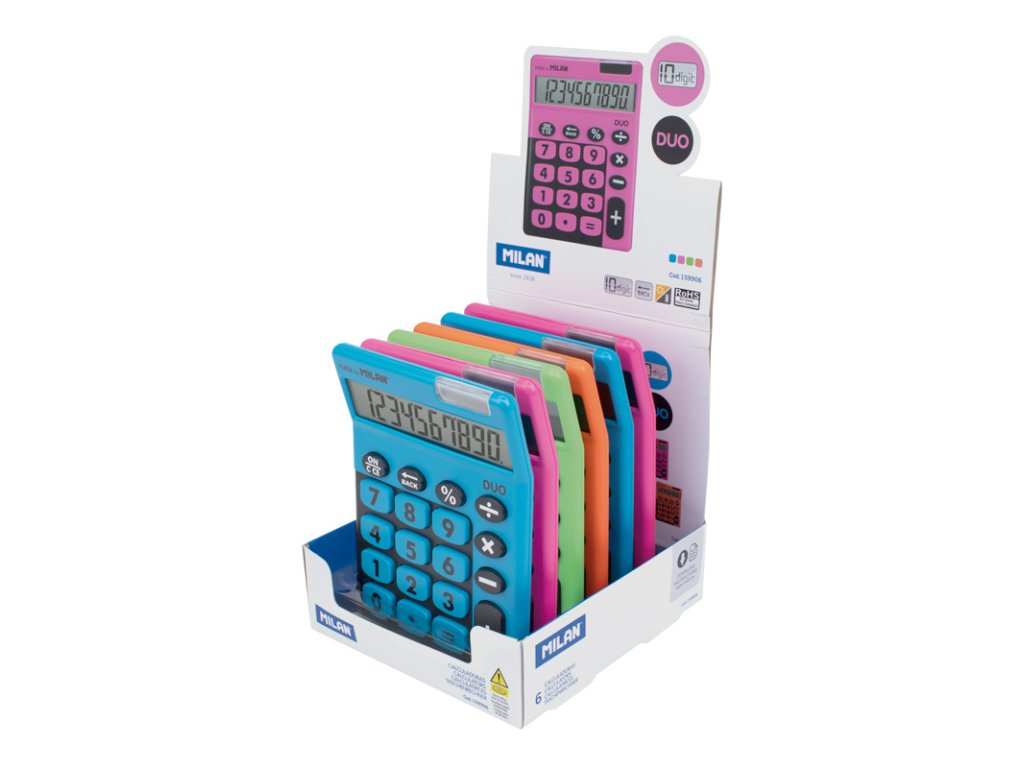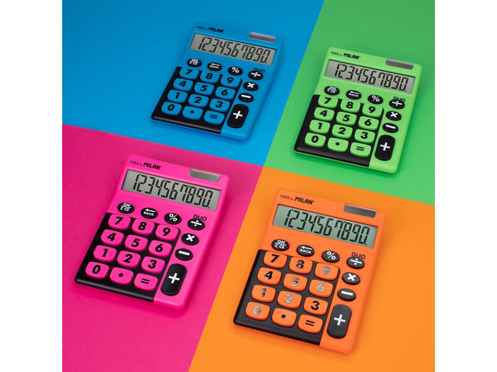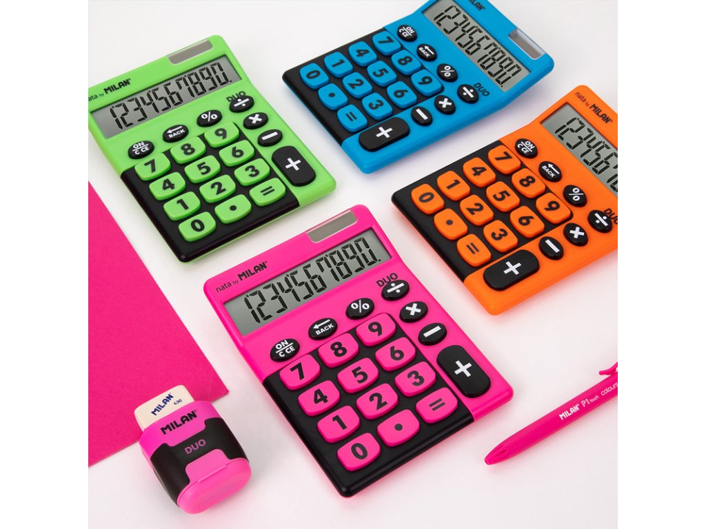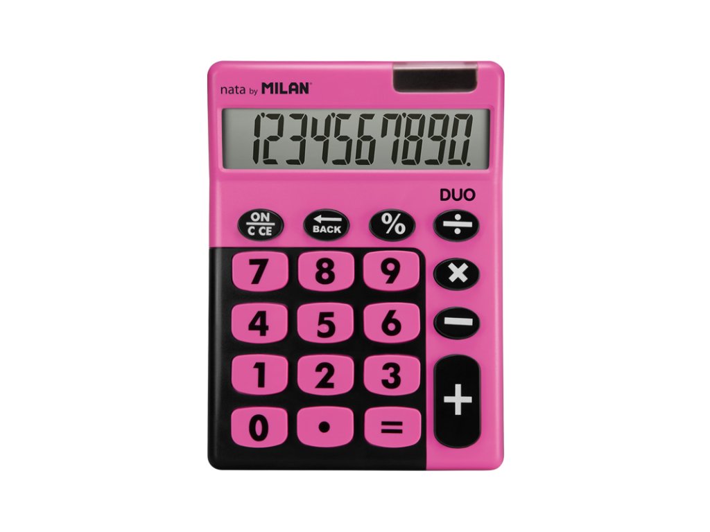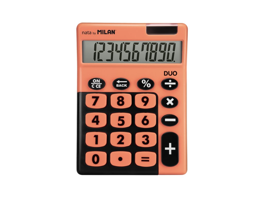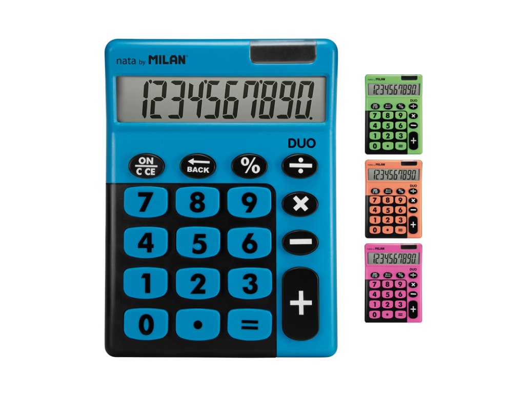 Stolní 10místná kalkulačka MILAN Duo s velkými tlačítky. Tlačítko „zpět“ umožňuje korekci špatně zadaných hodnot. Duální napájení: 1,5 V baterie + solární článek, automatické vypnutí. Barvy: modrá, růžová, zelená a oranžová – uveďte do poznámky při vytváření objednávky.Doplňkové parametry